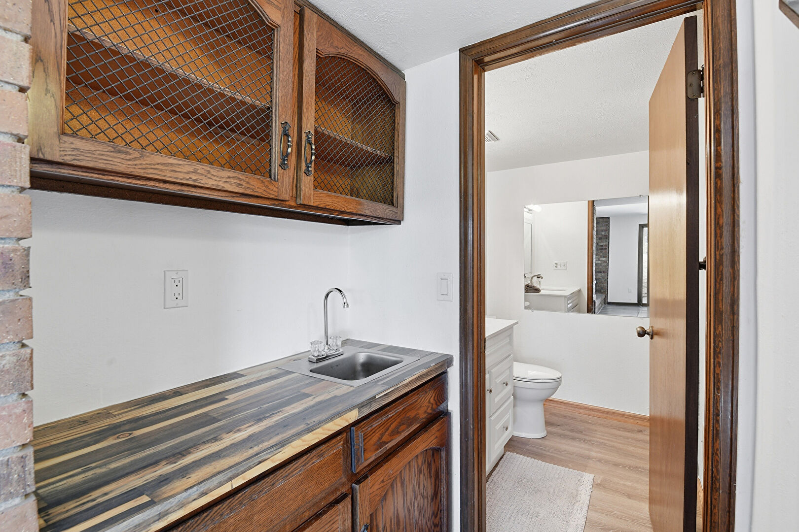 Butcher Block Countertops, Drywall, Glass Insert Cabinets, Indoor Bar, Medium Brown Cabinets, Shaker Cabinets, Wood Finish Floor, Dark Brown Cabinets