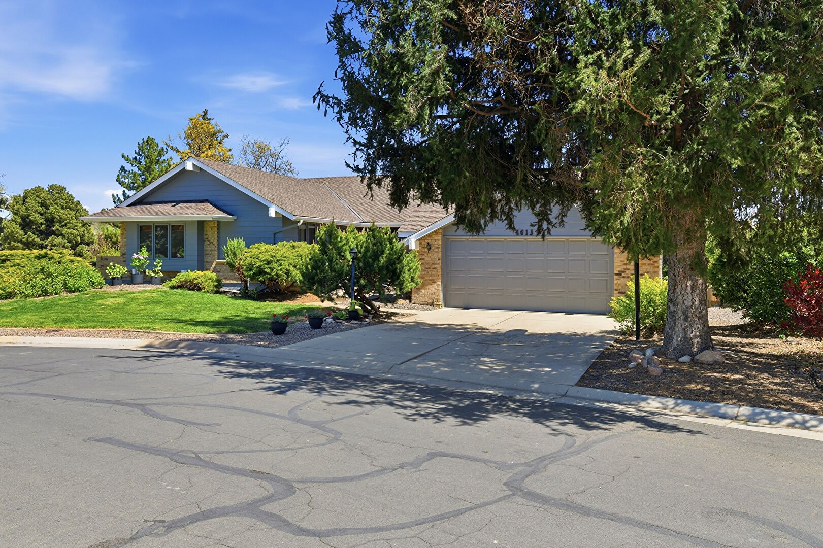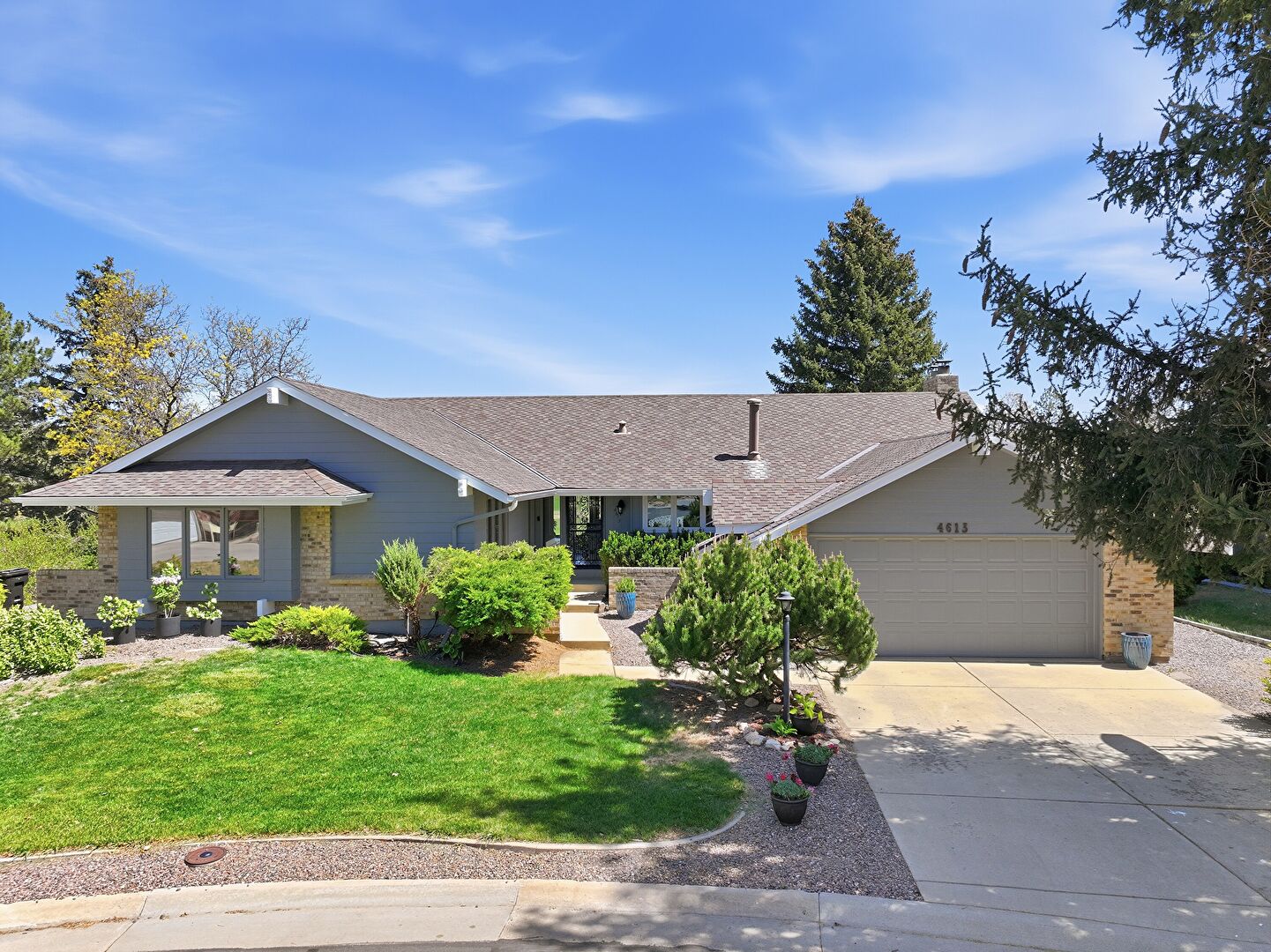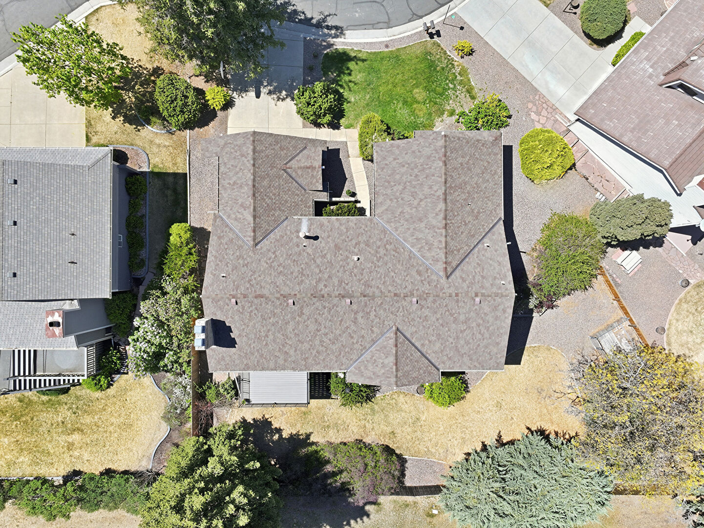 Brick Siding, Concrete Foundation, Downspout, Driveway, Horizontal Siding, Lawn, Shingle Roof, Brick Siding, Downspout, Lawn