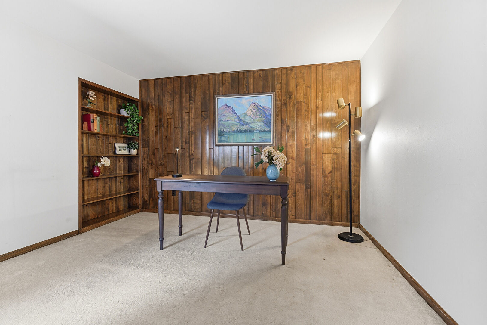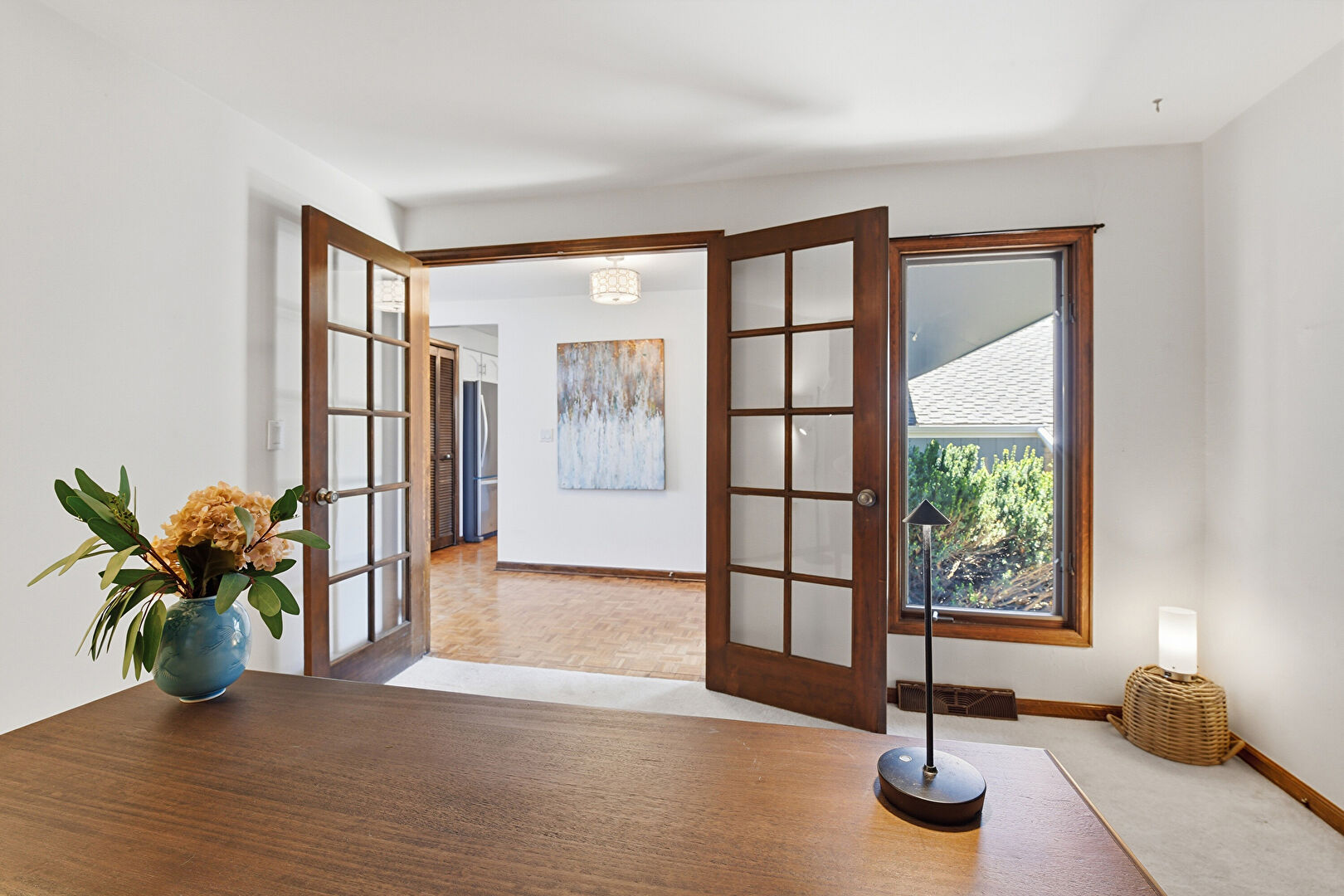 Accent Wall, Baseboards Wall, Carpet, Drywall, Natural Light, Office Area, French Doors, Wood Wall
