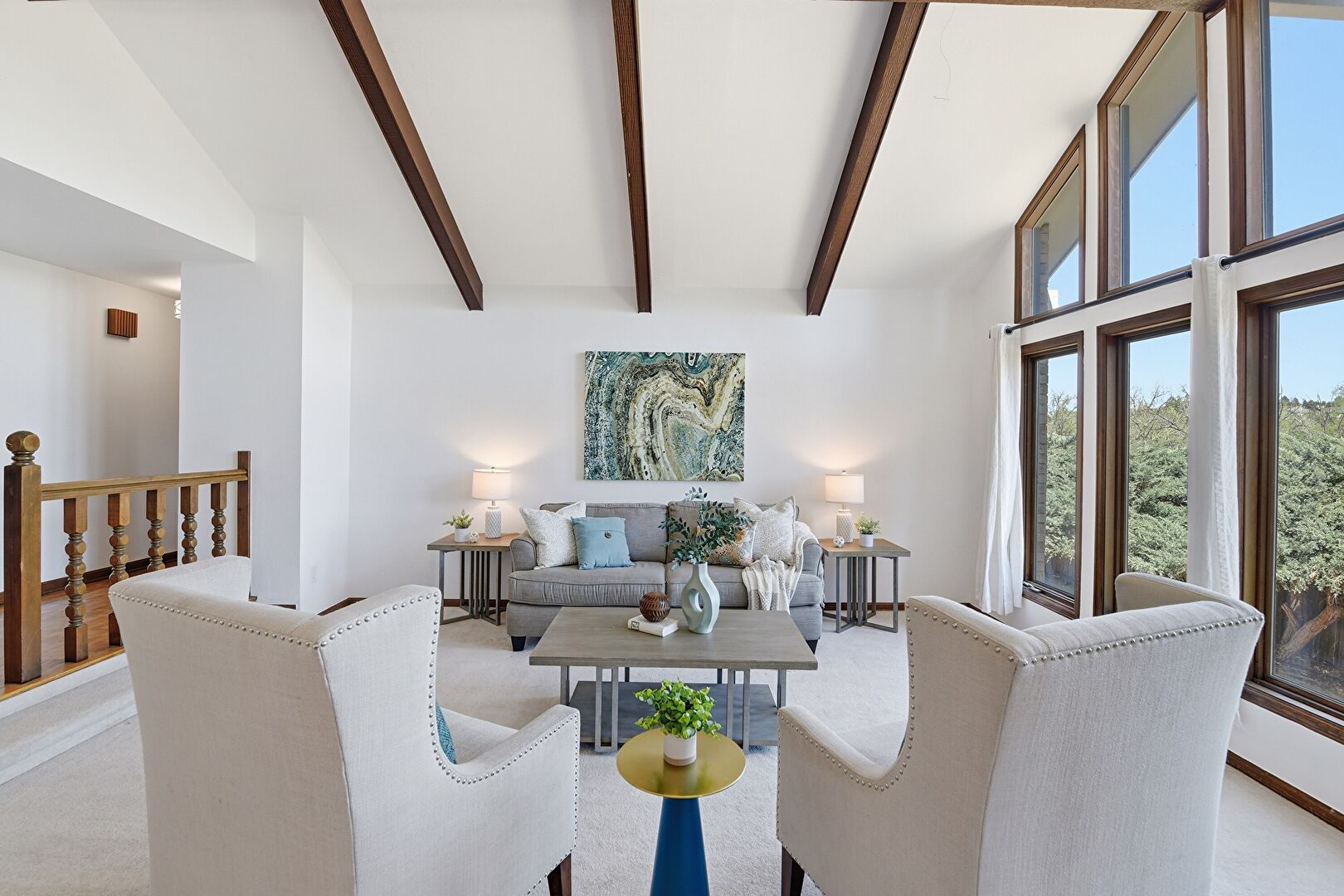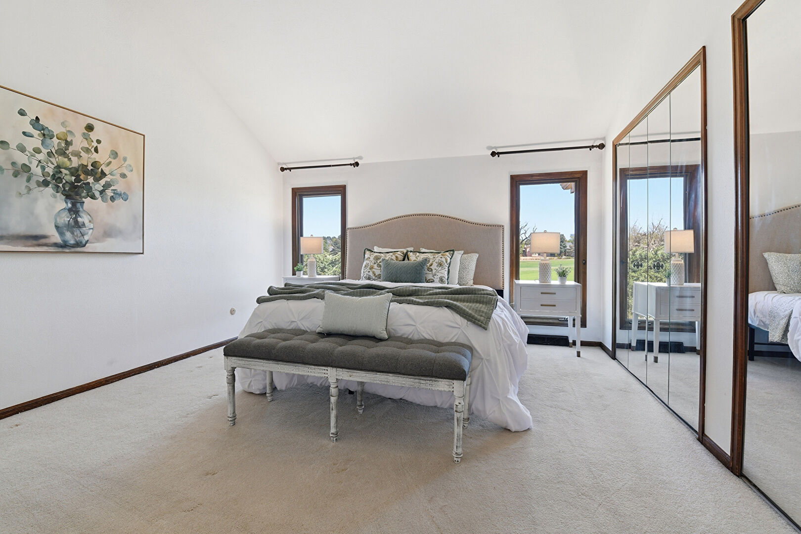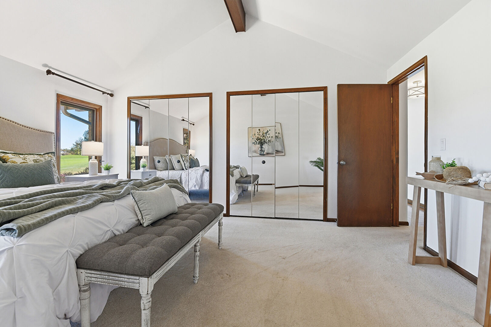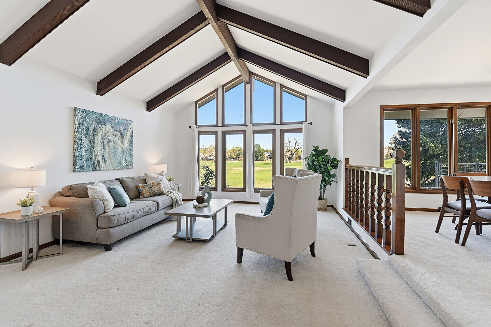 Baseboards Wall, Beamed Ceiling, Carpet, Cathedral Ceiling, Drywall, Golf Course View, High Ceiling, Natural Light, Vaulted Ceiling, Drywall, High Ceiling