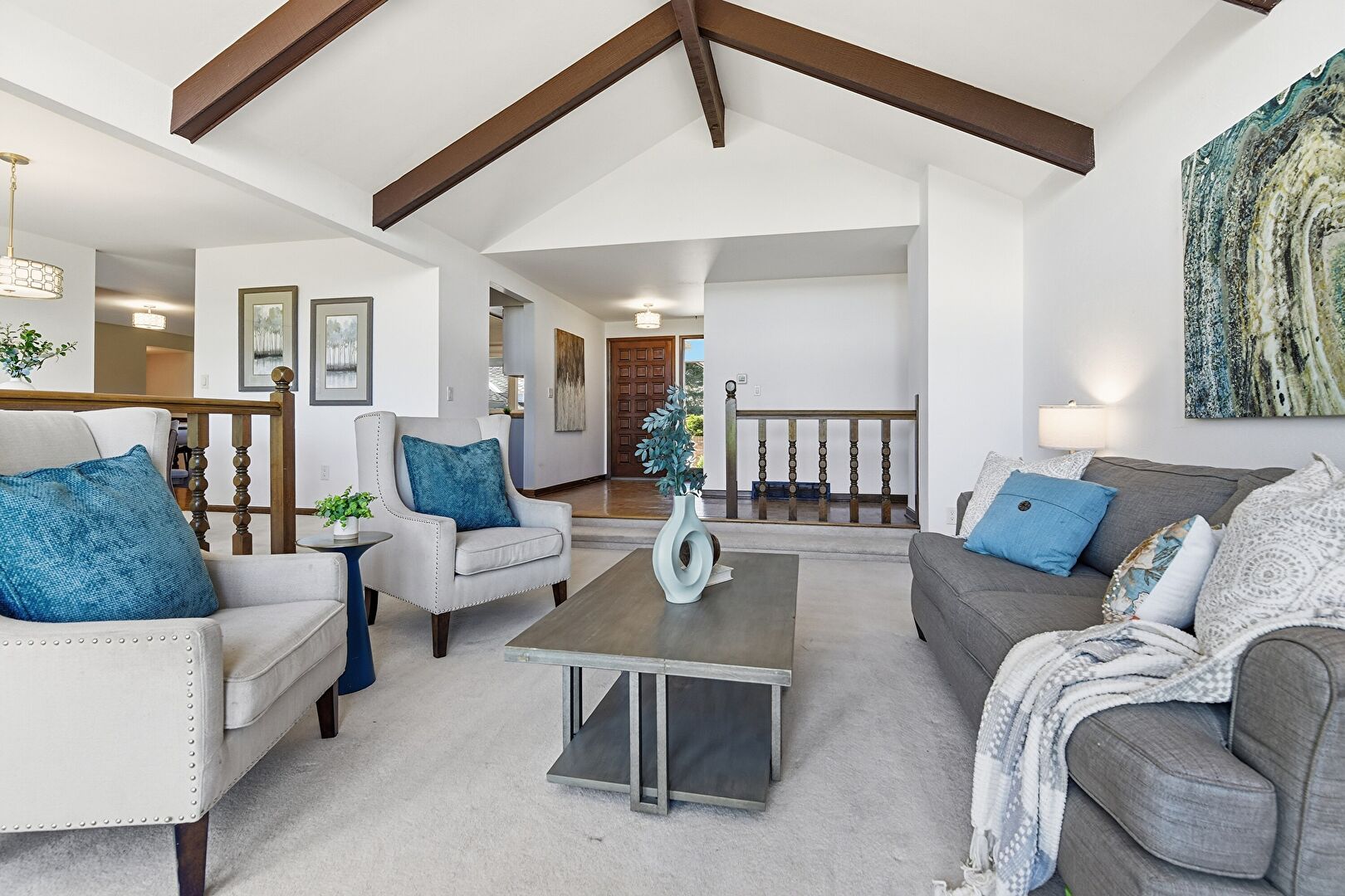 Baseboards Wall, Beamed Ceiling, Carpet, Drywall, Natural Light, Vaulted Ceiling, Wood Finish Floor, Drywall, Natural Light