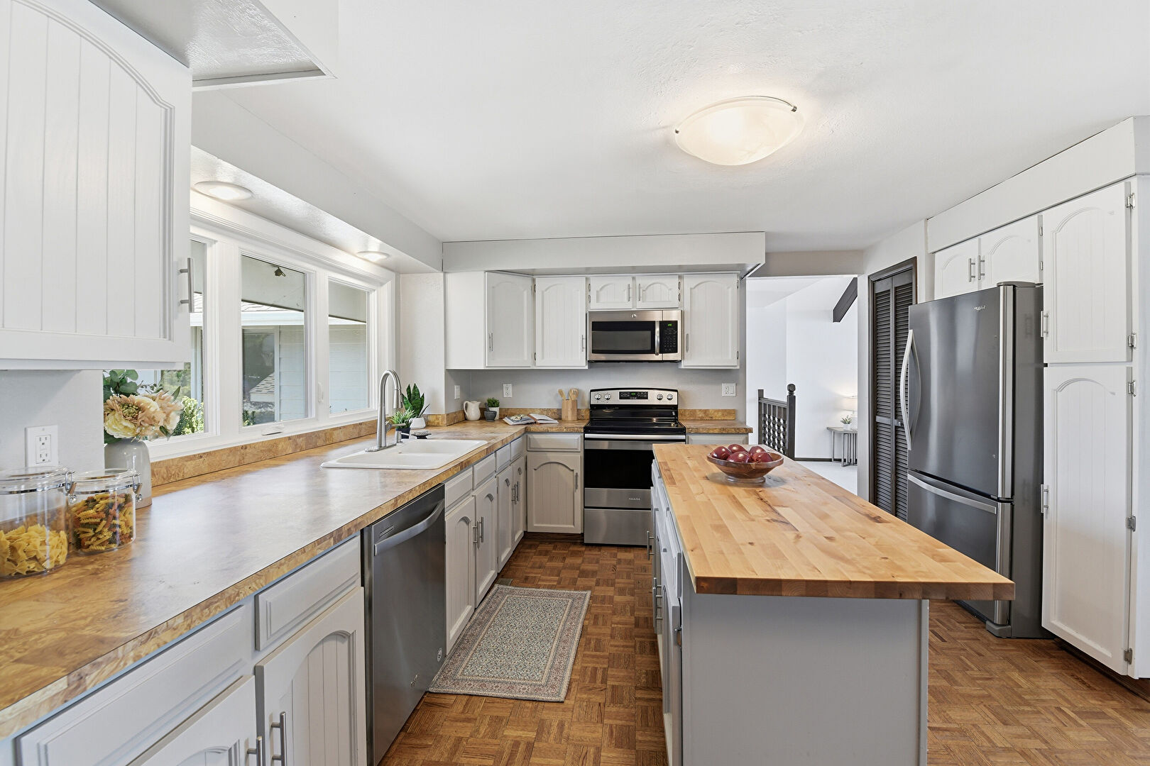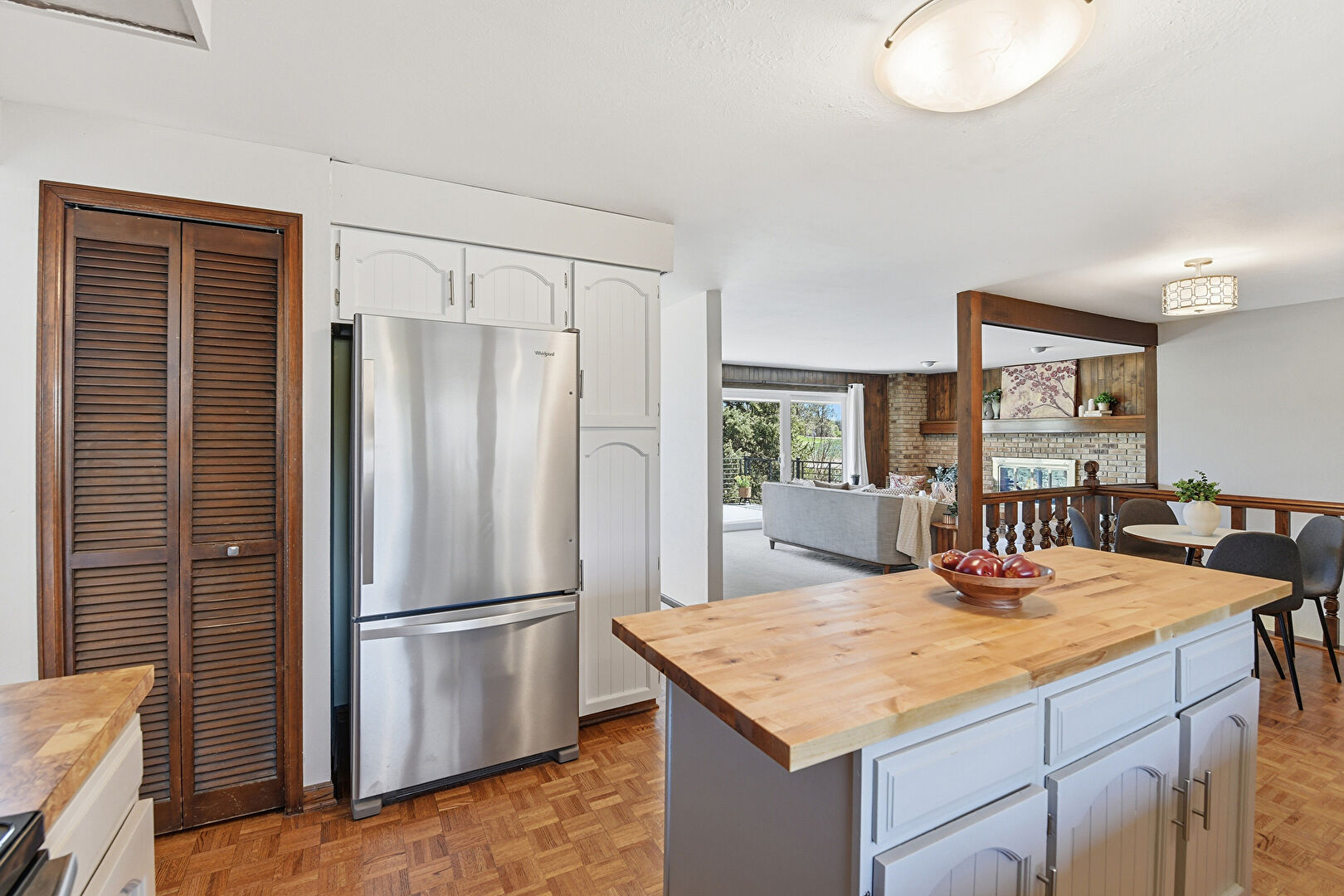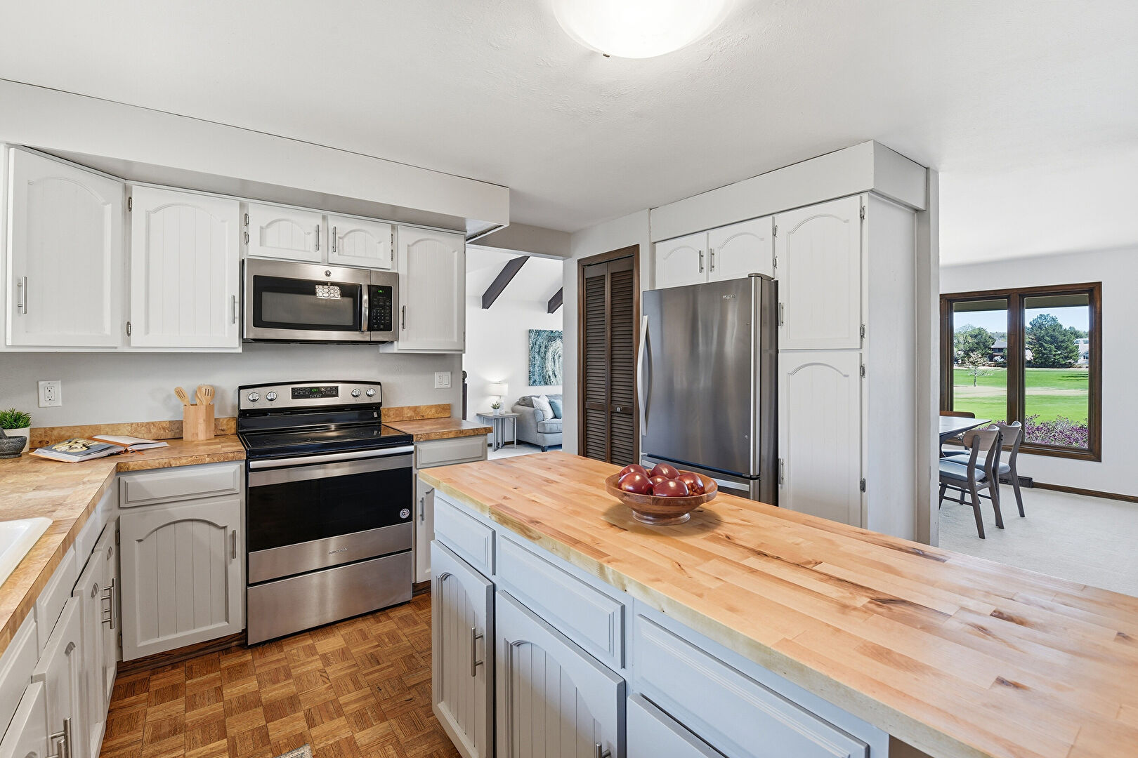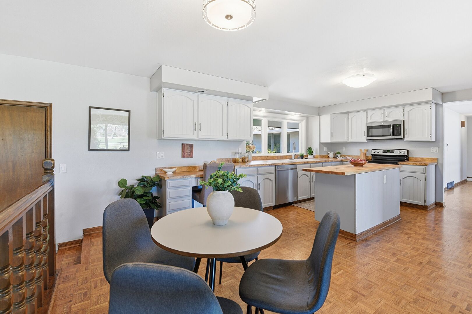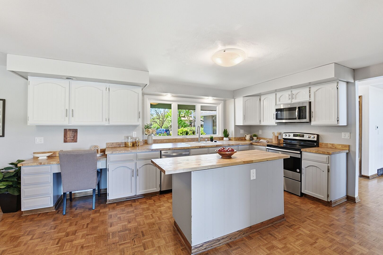 Arched Cabinets, Butcher Block Countertops, Drywall, Fireplace, Gray Cabinets, Kitchen Island, L Shaped Kitchen, Natural Light, Shaker Cabinets, Visible Hinge Cabinets, Wood Finish Floor, Baseboards Wall, Butcher Block Countertops, Drywall, Kitchen Island, Shaker Cabinets