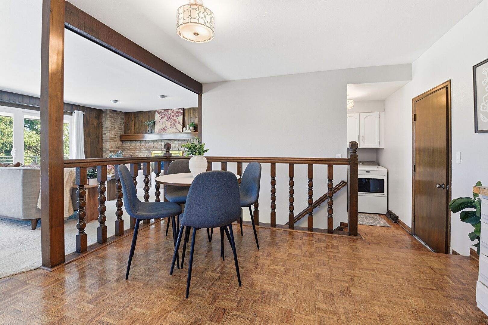 Arched Cabinets, Baseboards Wall, Brick Wall, Butcher Block Countertops, Drywall, Kitchen Island, Laundry, Natural Light, Shaker Cabinets, Washer Dryer, Wood Finish Floor, Natural Light, Visible Hinge Cabinets