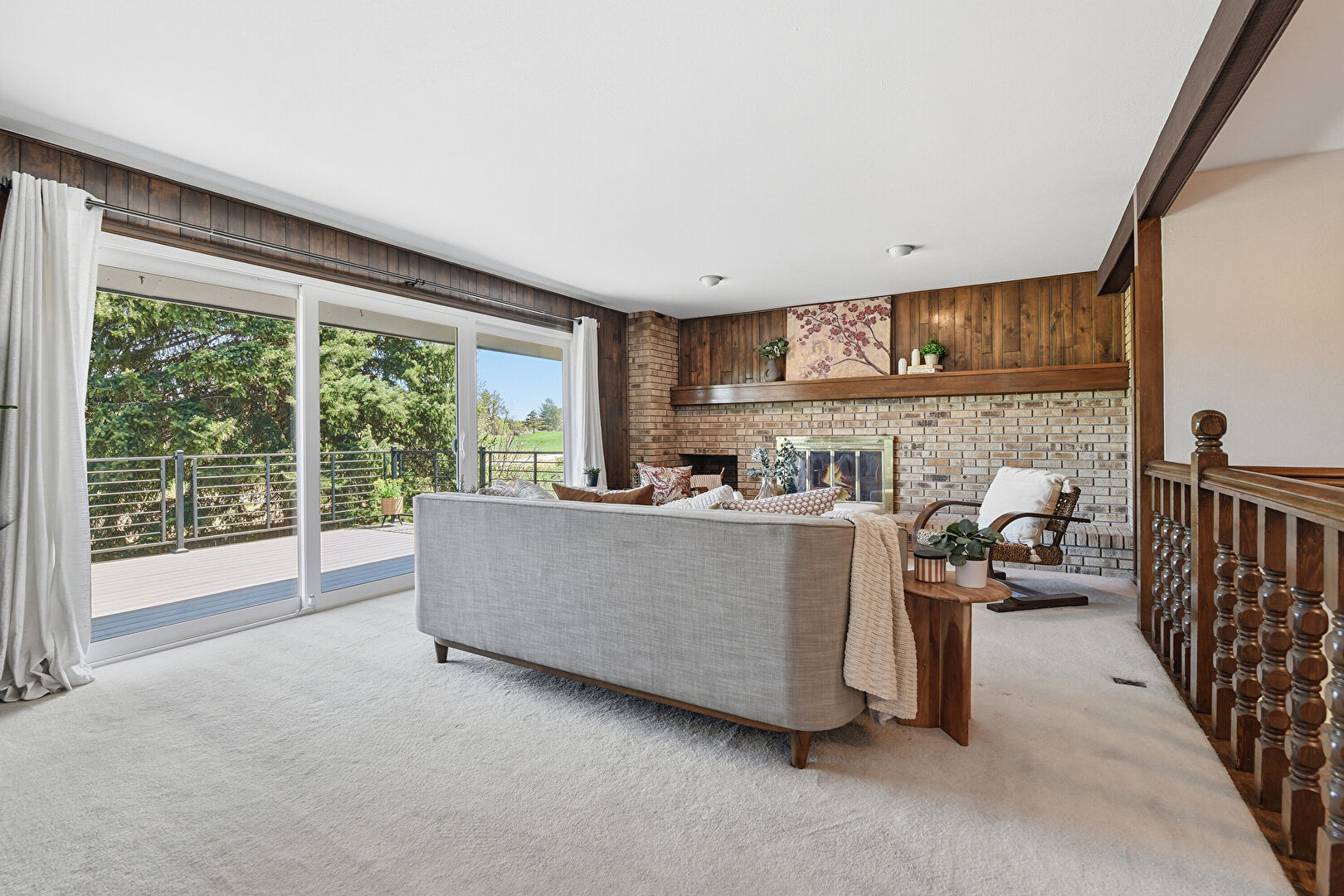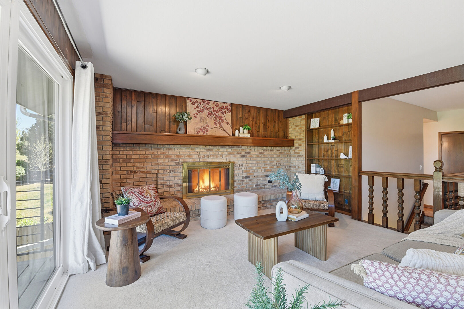 Brick Wall, Built In Shelves, Carpet, Drywall, Fireplace, Natural Light, Wood Wall, Carpet, Fireplace, Natural Light