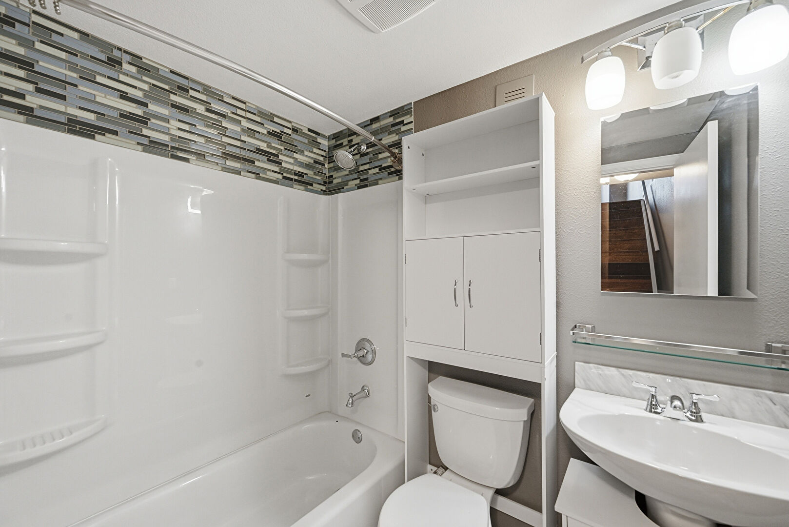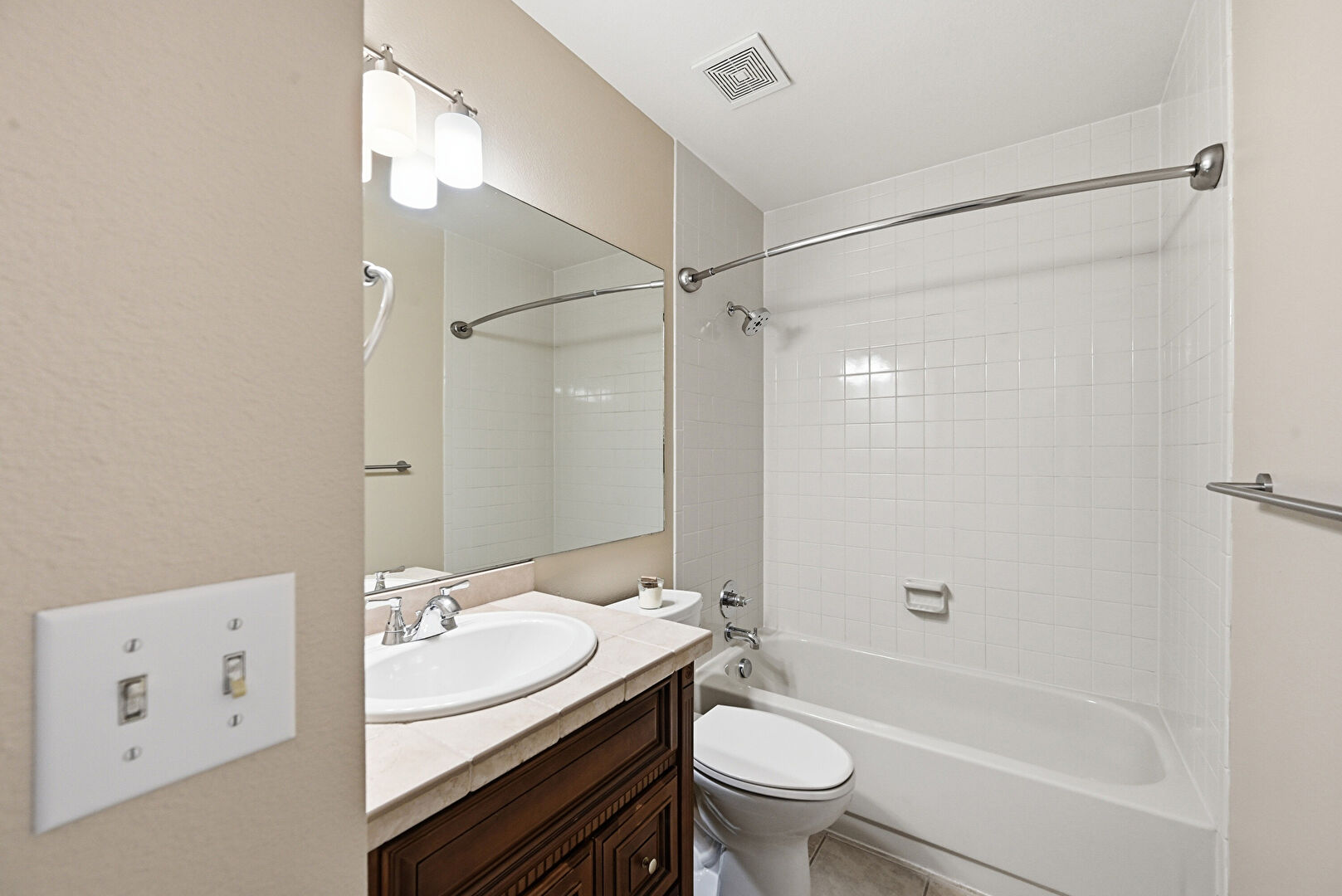 Combined Bath Shower, Full Bathroom, Vanity, Vent, Tile Floor