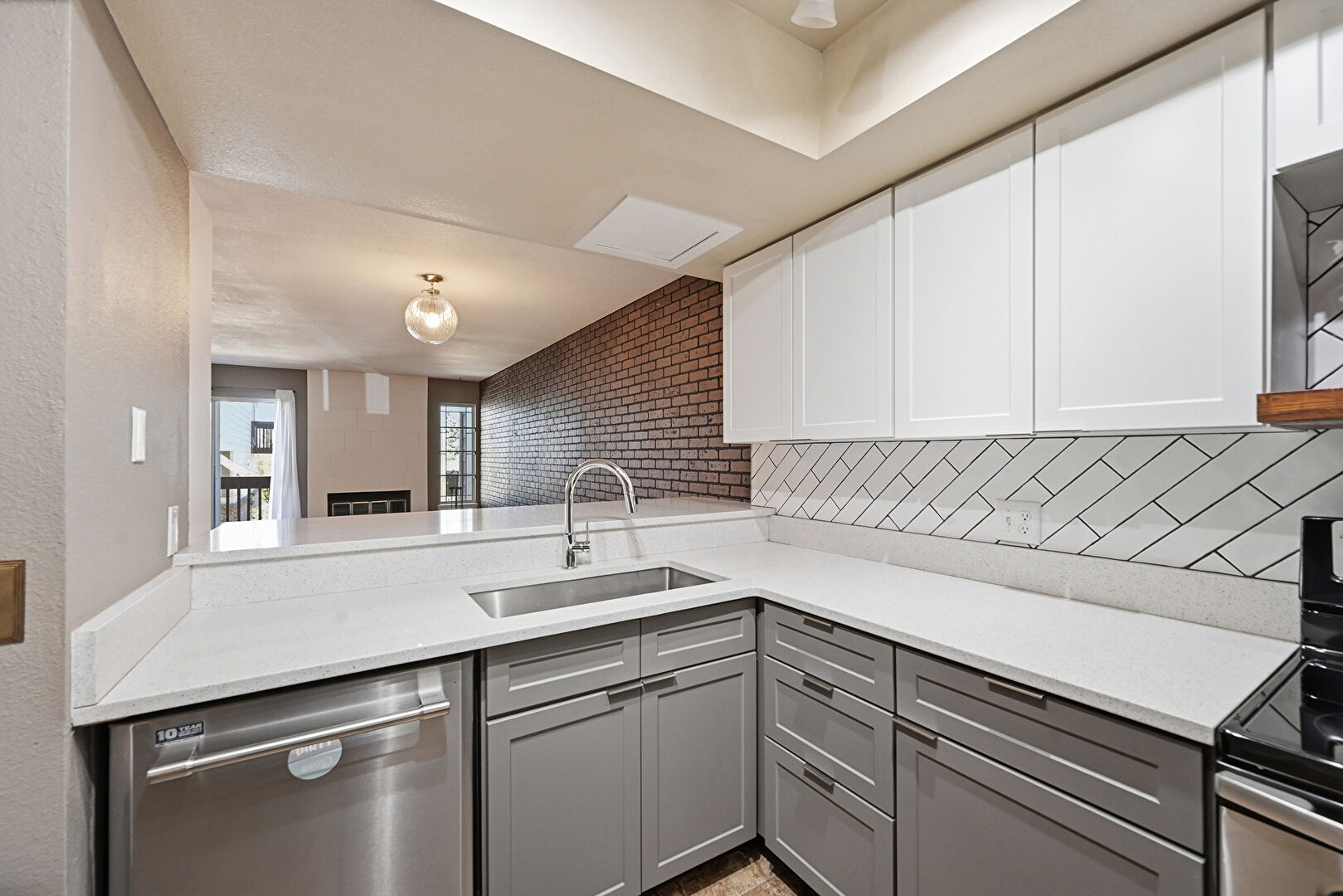Gray Cabinets, Natural Light, Pass Through Window, Shaker Cabinets, Stone Countertops, Stone Finish Floor, Textured Wall, Tray Ceiling, Kitchen Peninsula, Track Lighting