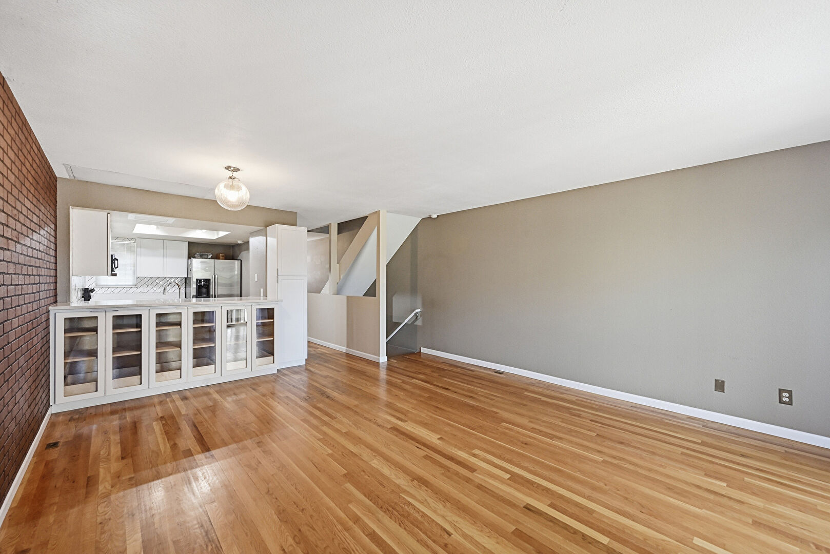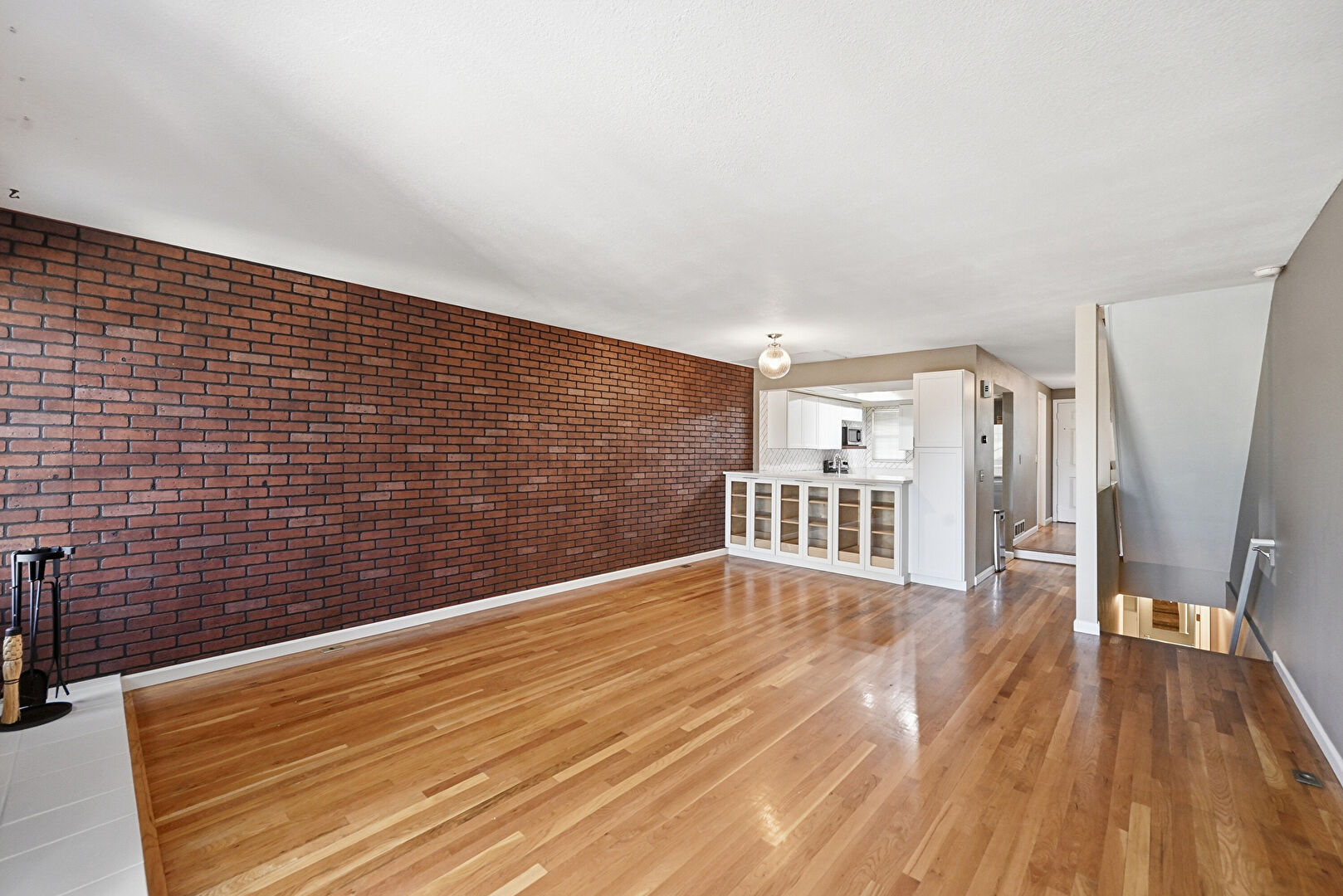 Baseboards Wall, Brick Wall, Drywall, Fireplace, Natural Light, Stairs, Wood Finish Floor, Accent Wall, Baseboards Wall