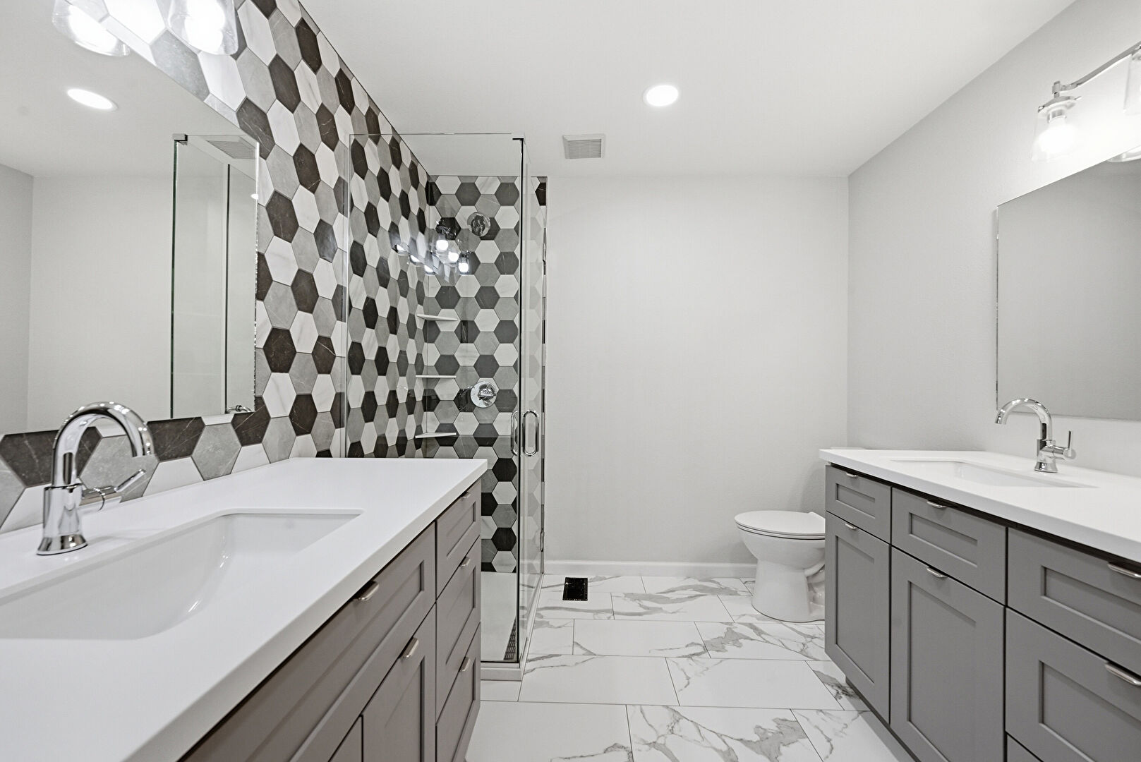 Drywall, Full Bathroom, Marble Finish Floor, Recessed Lighting, Tile Wall, Two Single Vanities, Vent, Baseboards Wall
