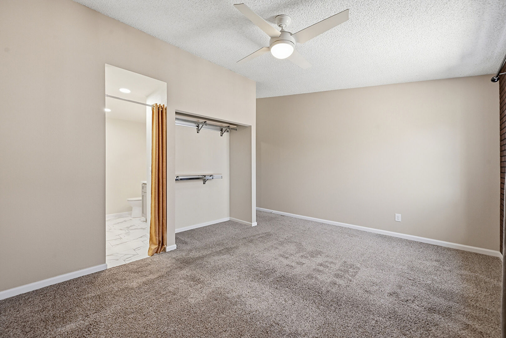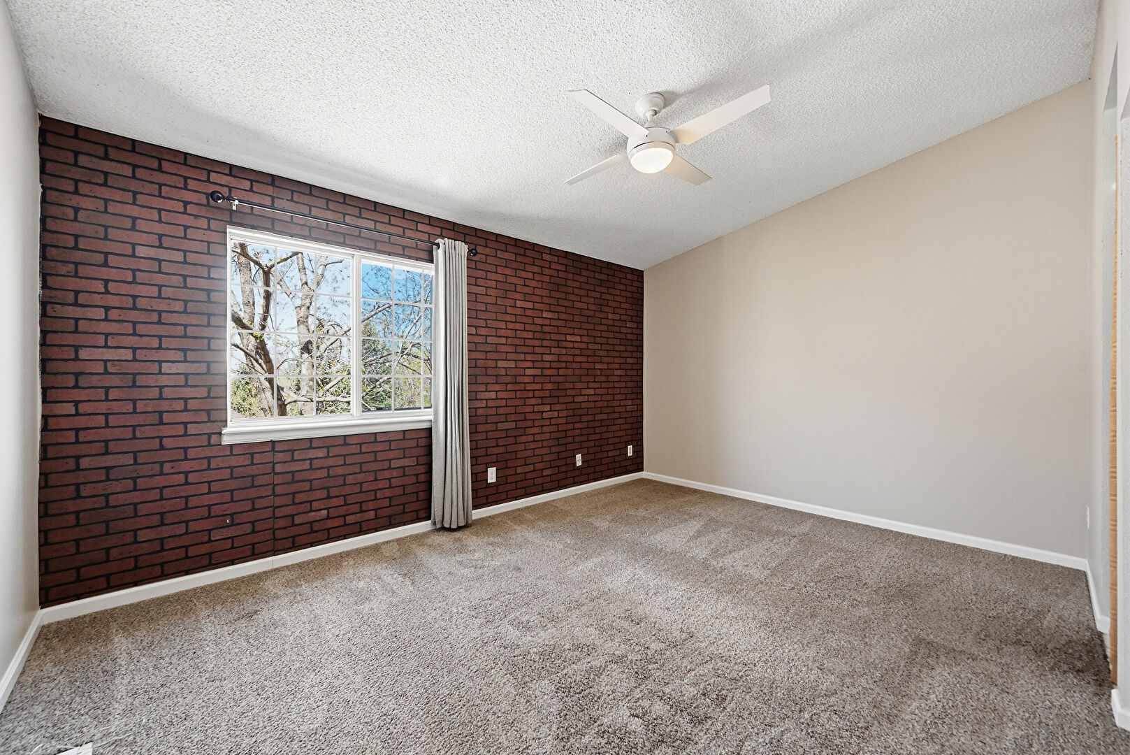 Accent Wall, Baseboards Wall, Brick Wall, Ceiling Fan, Closet, Drywall, Ensuite Bathroom, Natural Light, Textured Ceiling, Carpet