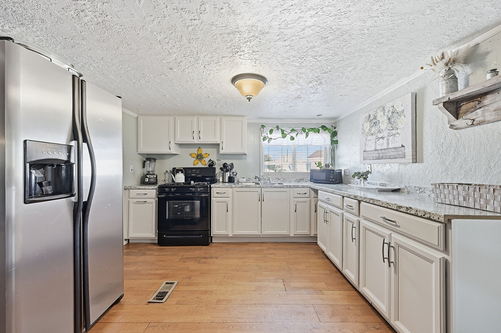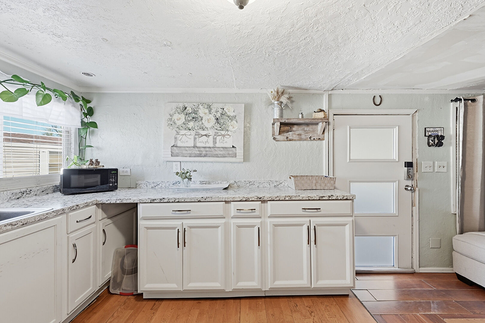 Baseboards Wall, Crown Molding, Natural Light, Open Shelves, Opens To Living Area, Shaker Cabinets, Stone Countertops, Textured Ceiling, Textured Wall, U Shaped Kitchen, Vent, Wood Finish Floor, Stone Countertops, Textured Wall, Wood Finish Floor