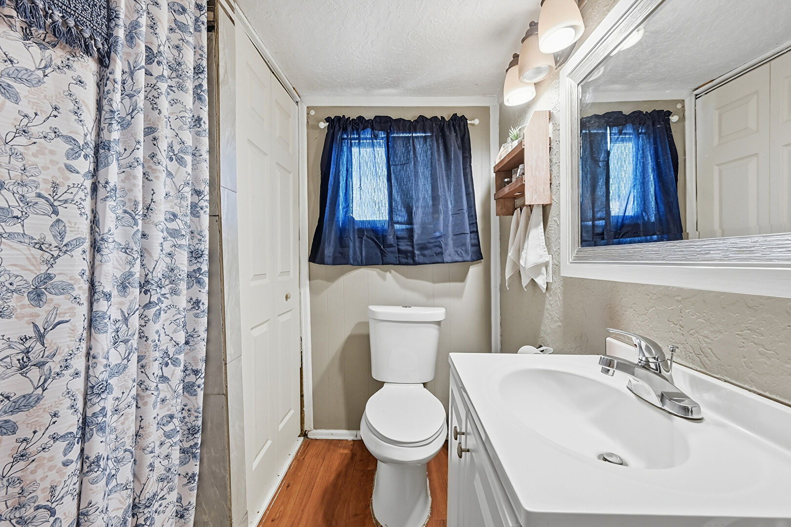 Baseboards Wall, Closet, Textured Ceiling, Textured Wall, Vanity, Wood Finish Floor, Full Bathroom