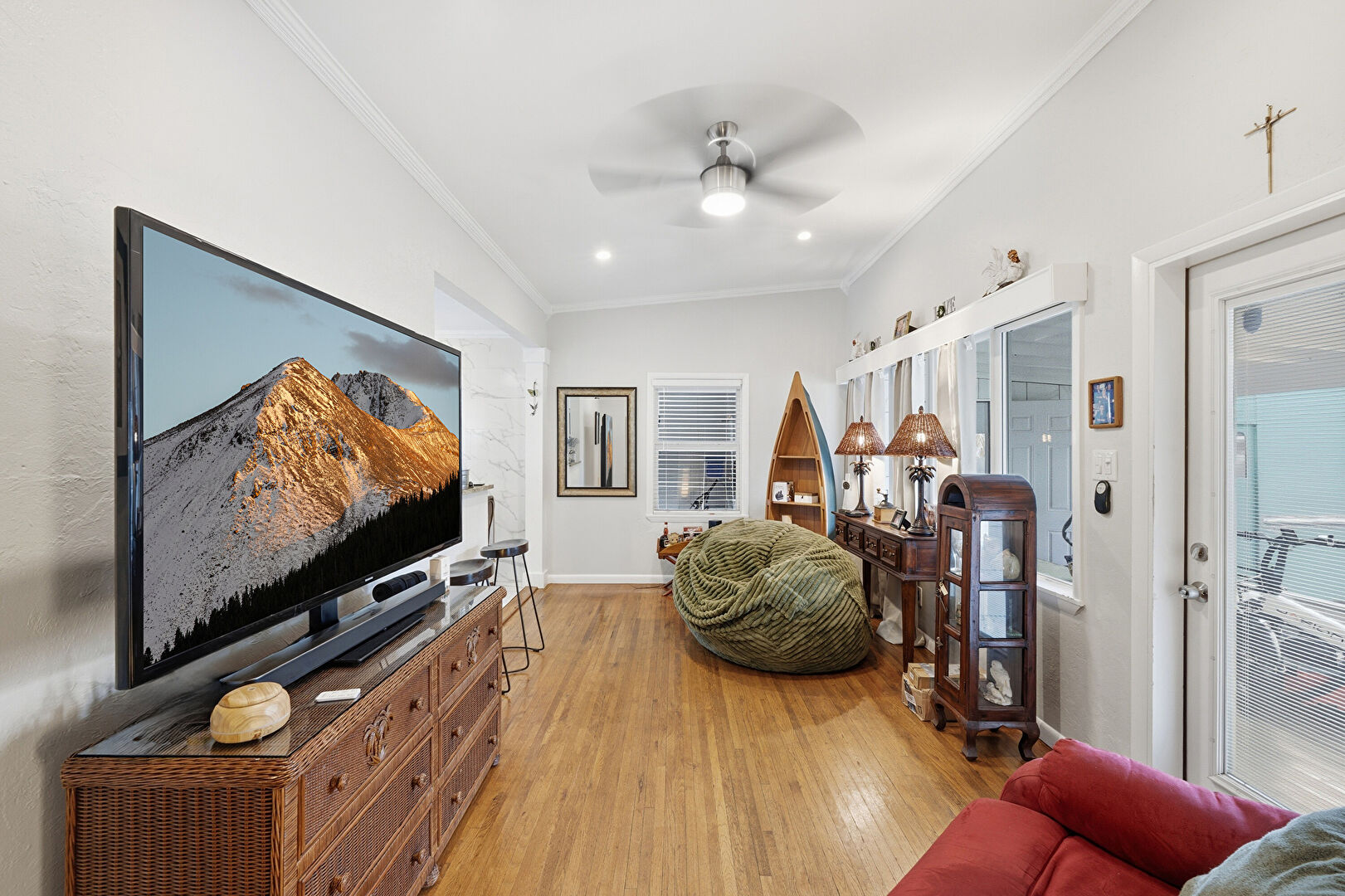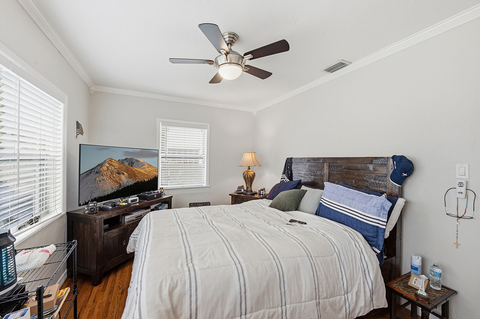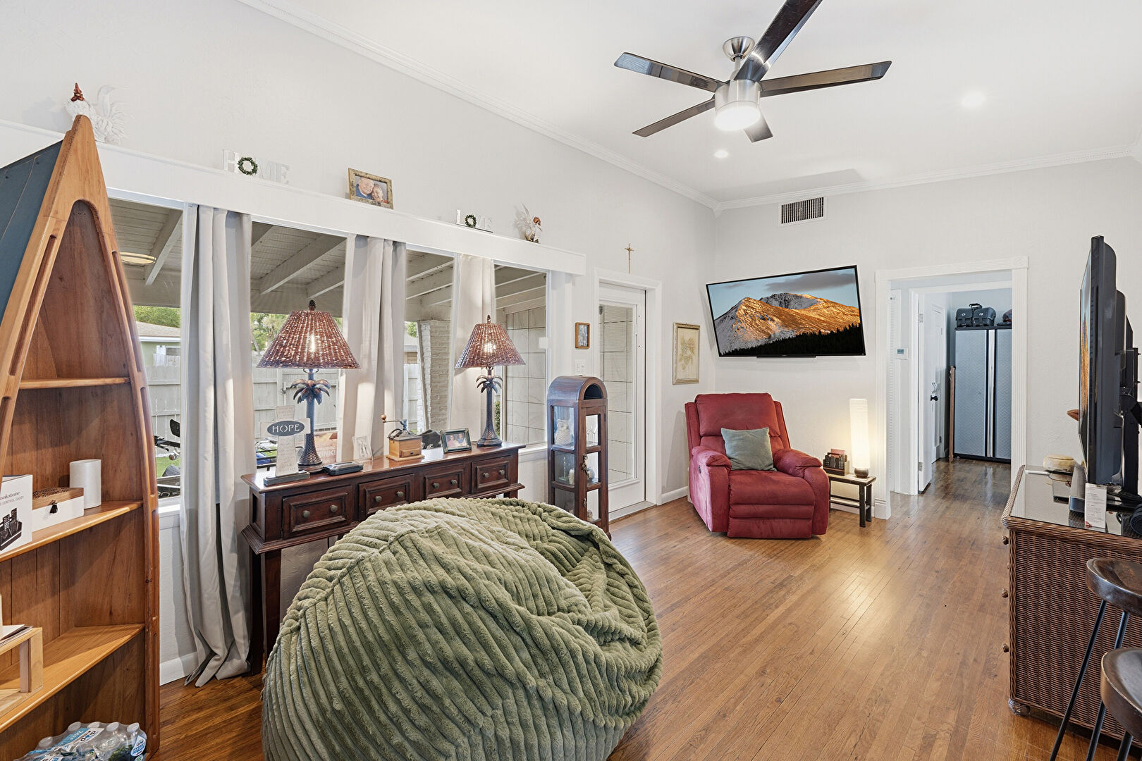 Baseboards Wall, Ceiling Fan, Crown Molding, Drywall, Natural Light, Vent, Wood Finish Floor, Ceiling Fan, Natural Light, Vent, Wood Finish Floor