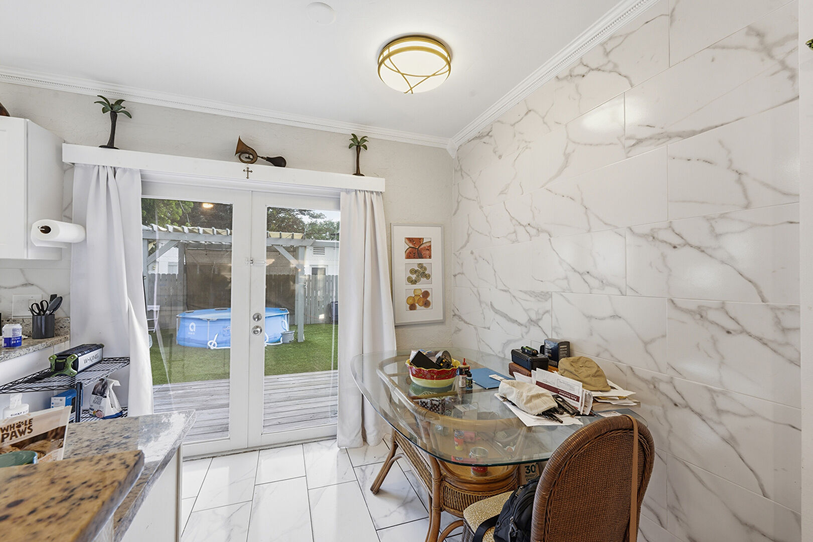 Accent Wall, Crown Molding, Drywall, French Doors, Marble Finish Floor, Tile Wall, Natural Light