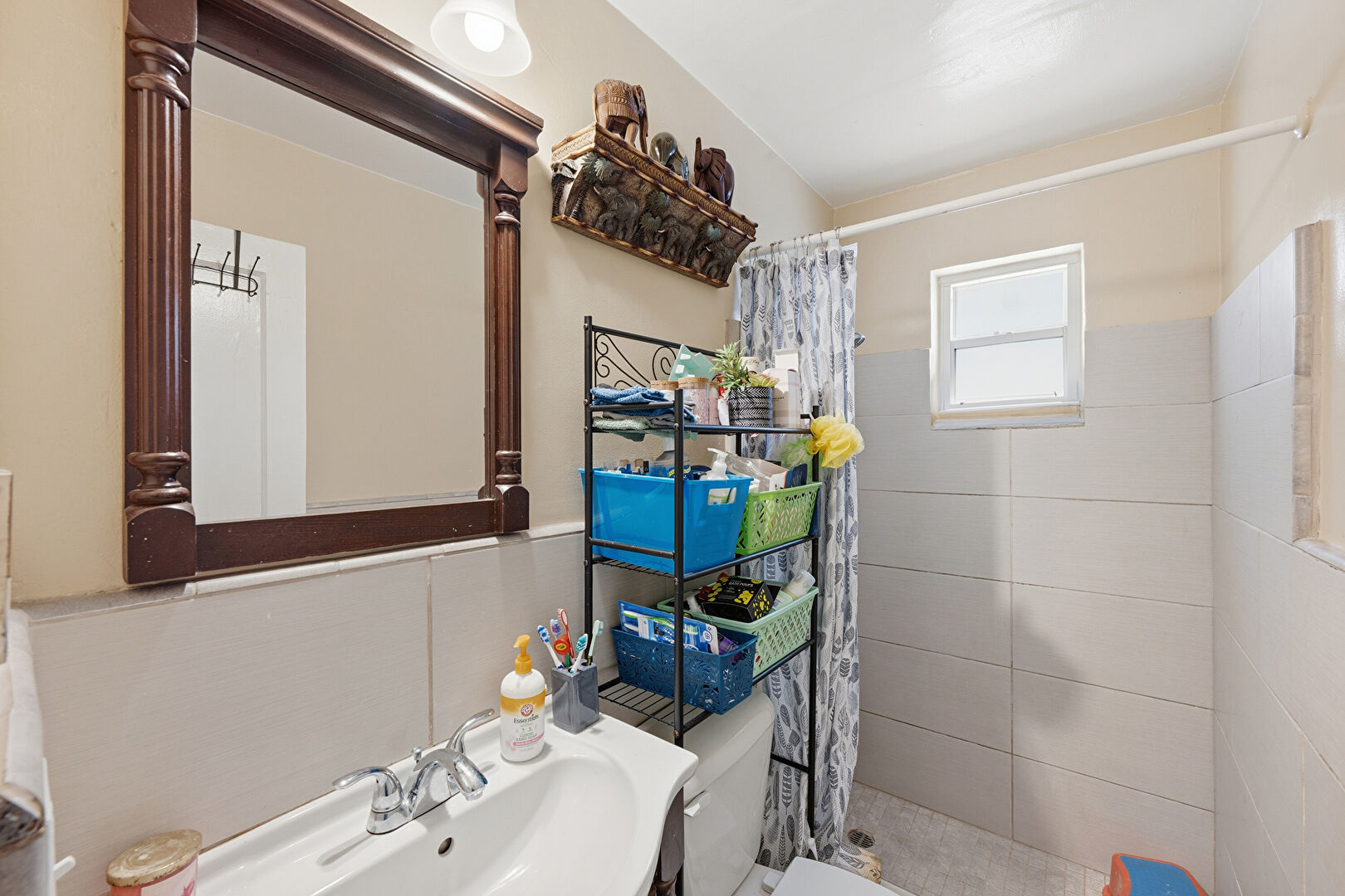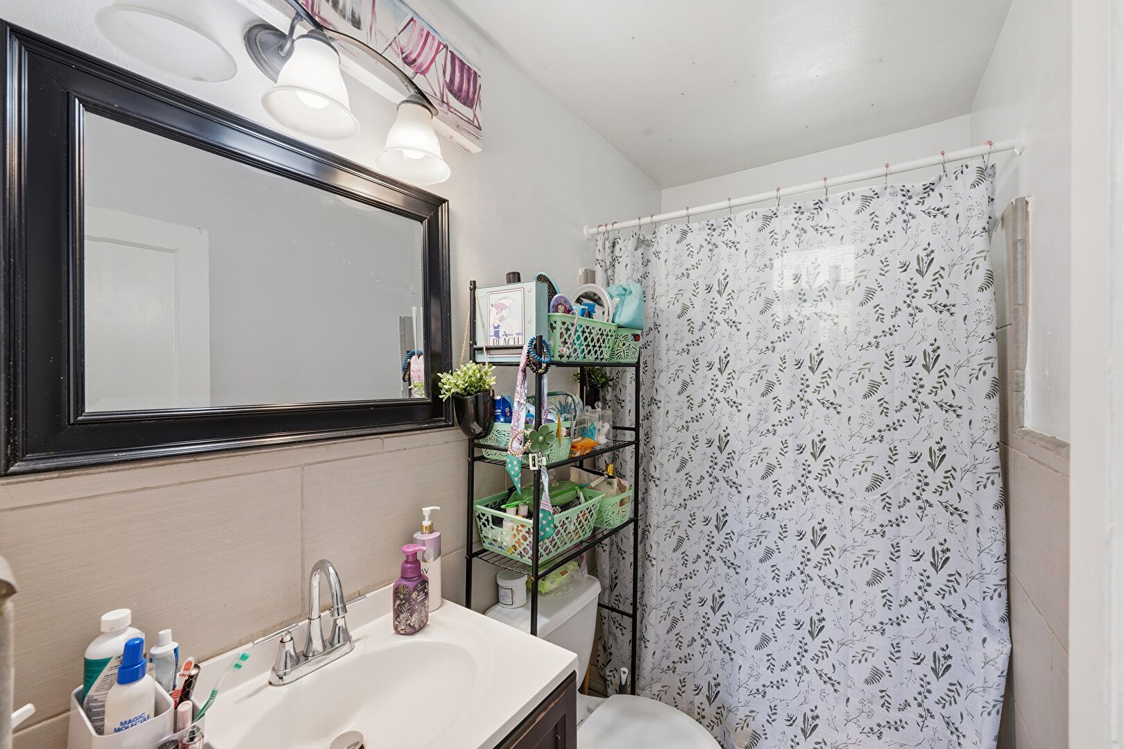 Drywall, Natural Light, Tile Wall, Vanity, Wainscot Wall, Full Bathroom