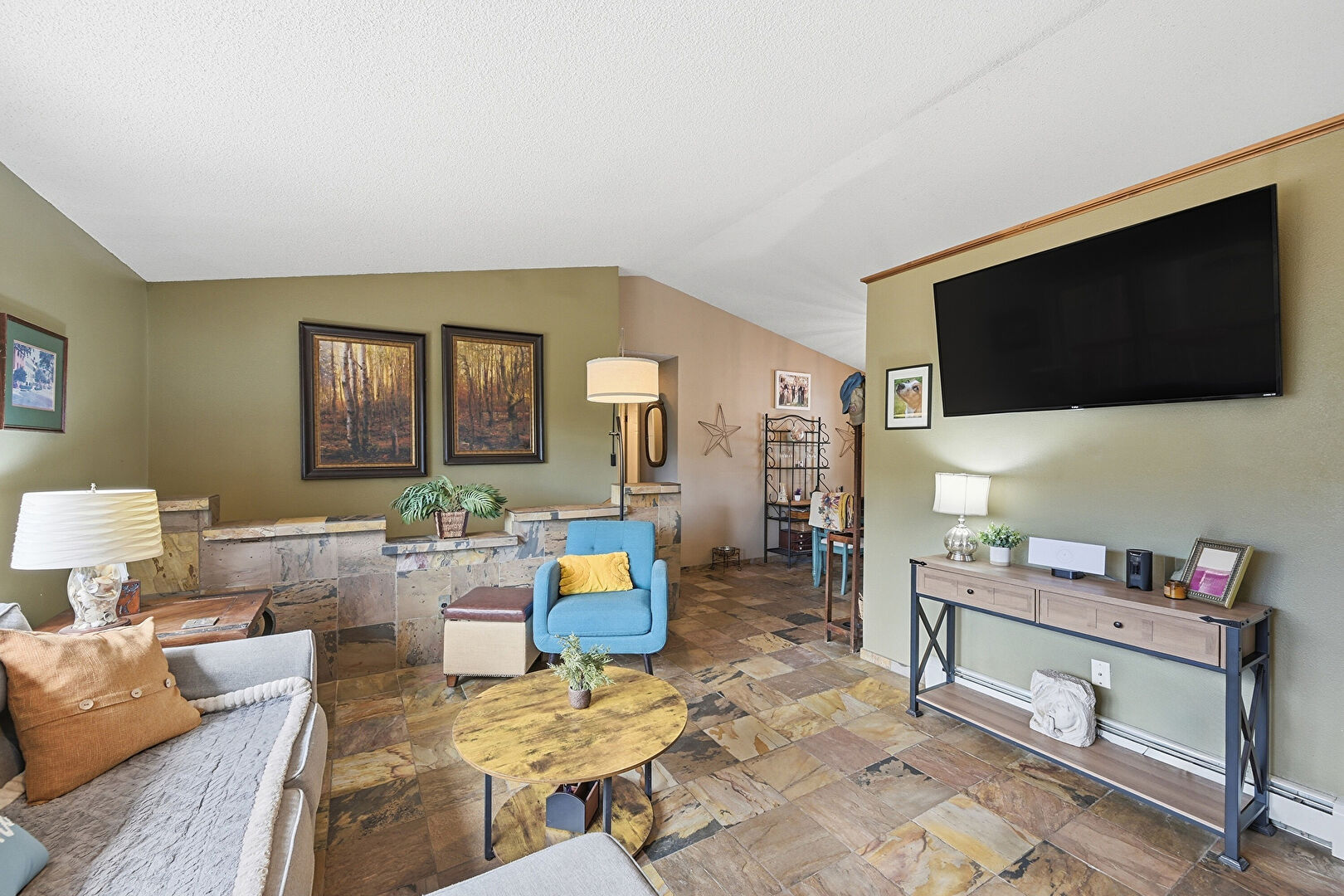 Baseboard Radiator, Baseboards Wall, Drywall, Fireplace, Mountain View, Natural Light, Stone Finish Floor, Textured Ceiling, Track Lighting, Vaulted Ceiling, Fireplace, Textured Ceiling, Vaulted Ceiling