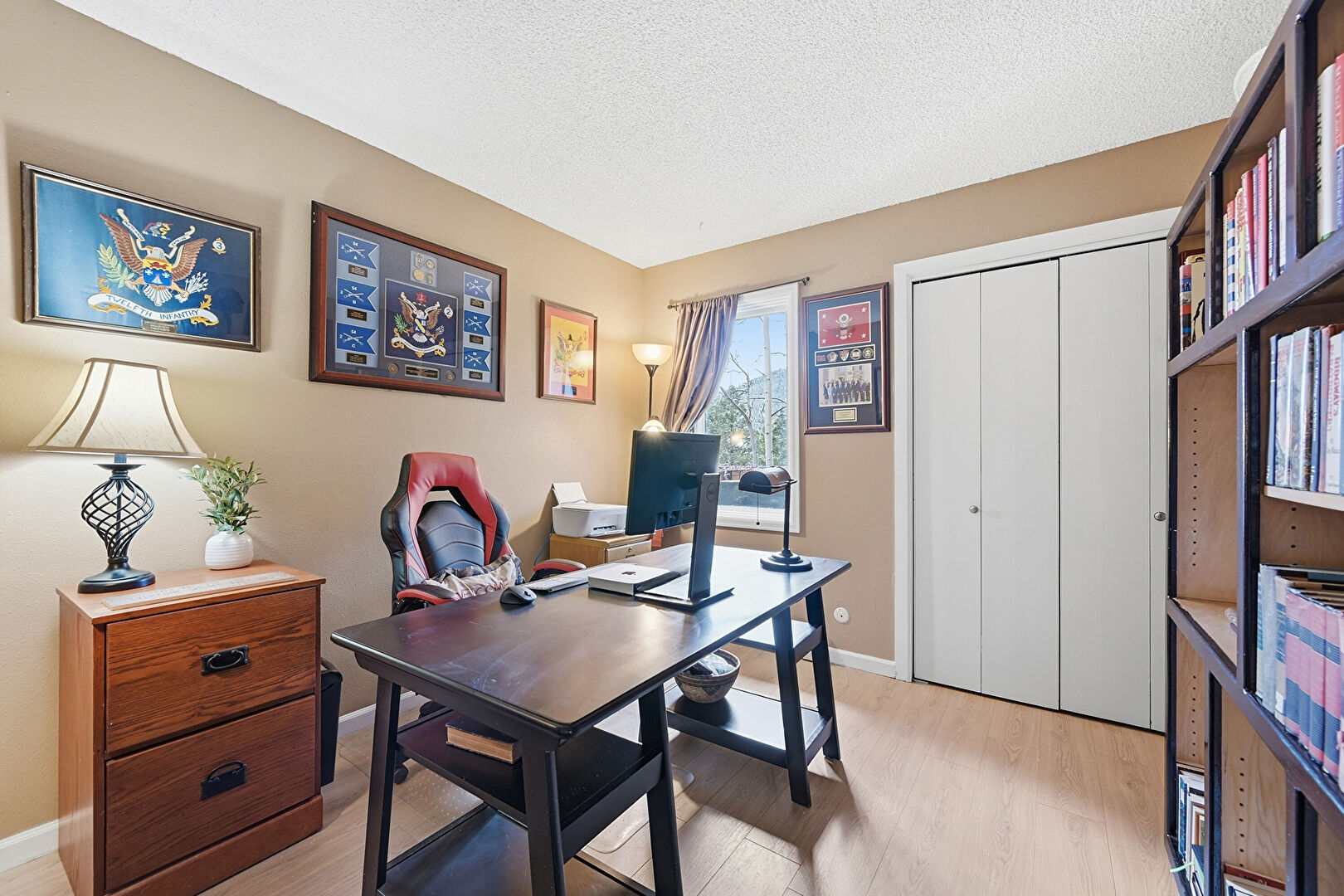 Baseboards Wall, Drywall, Office Area, Textured Ceiling, Wood Finish Floor, Natural Light