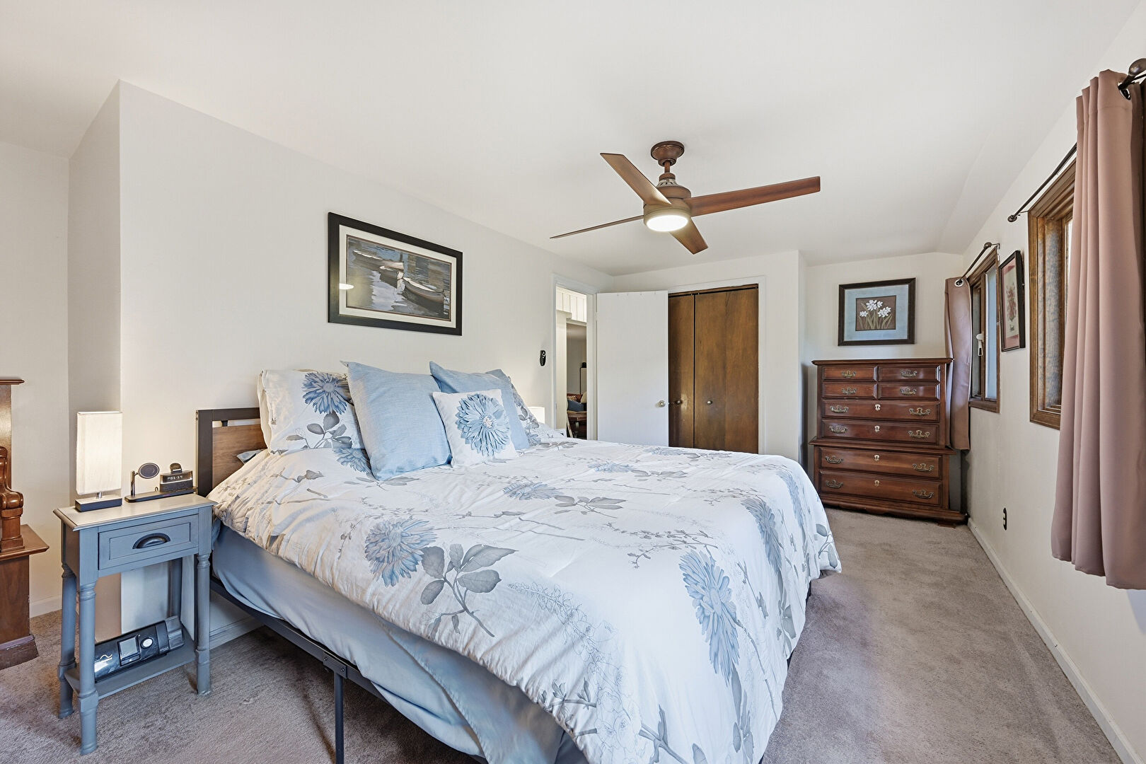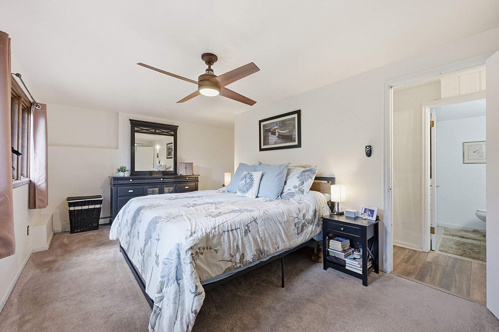Baseboard Radiator, Baseboards Wall, Carpet, Ceiling Fan, Closet, Drywall, Ensuite Bathroom, Natural Light, Textured Ceiling, Wood Finish Floor, Baseboards Wall, Carpet, Natural Light, Textured Ceiling