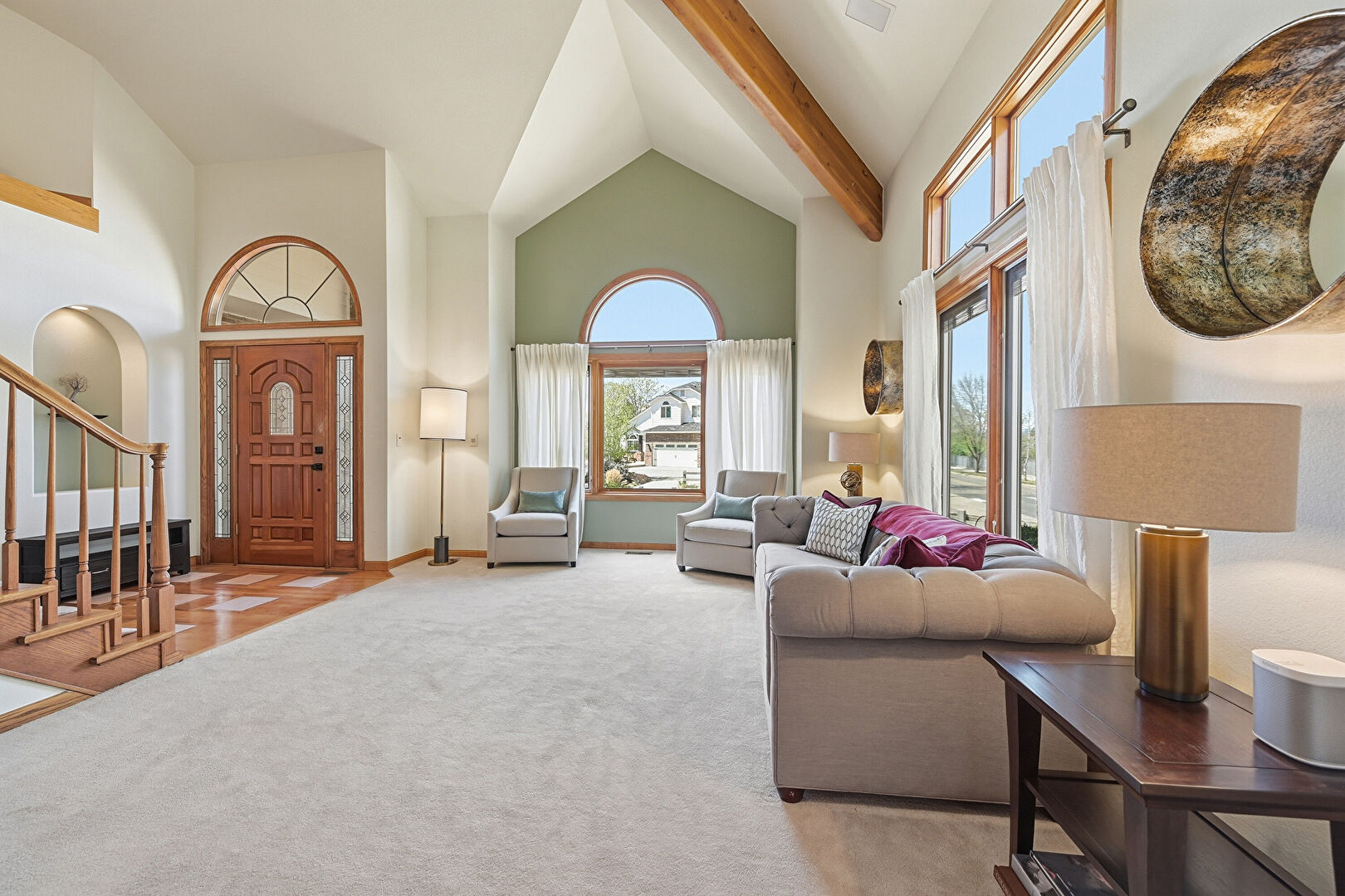 Baseboards Wall, Beamed Ceiling, Drywall, High Ceiling, Natural Light, Stairs, Vaulted Ceiling, Carpet