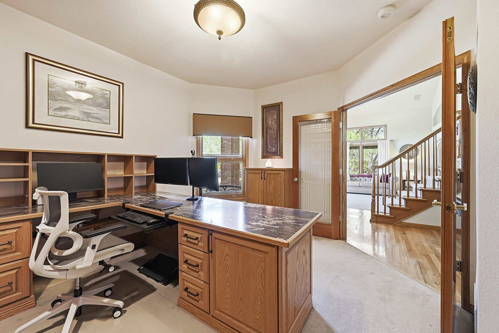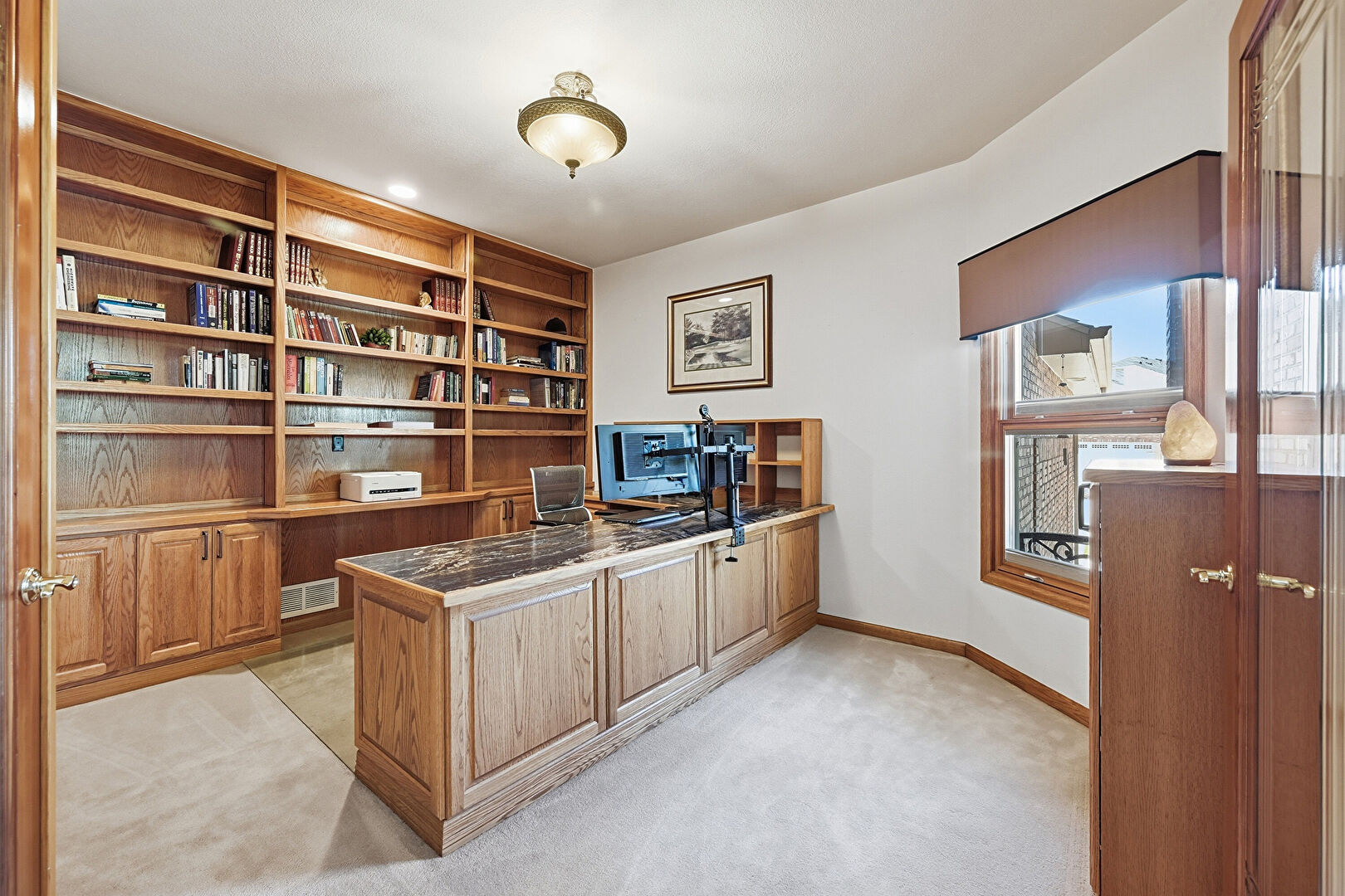 Baseboards Wall, Built In Shelves, Drywall, Natural Light, Office Area, Recessed Lighting, Smoke Carbon Monoxide Detector, Vent, Carpet