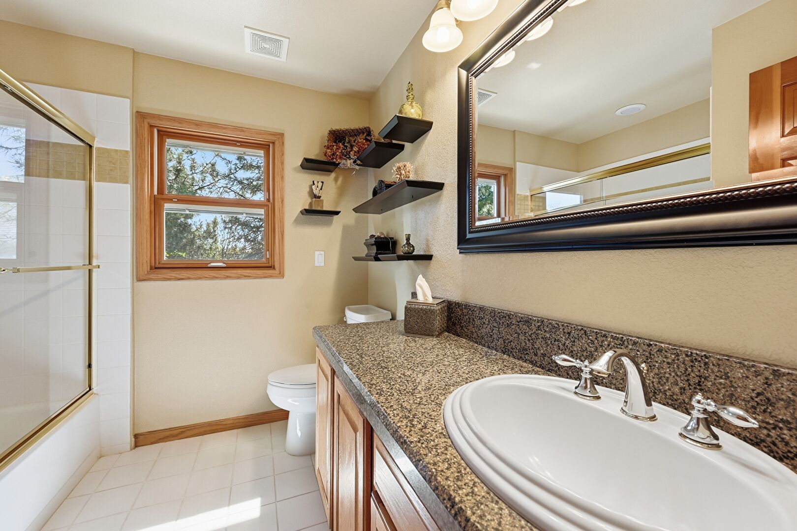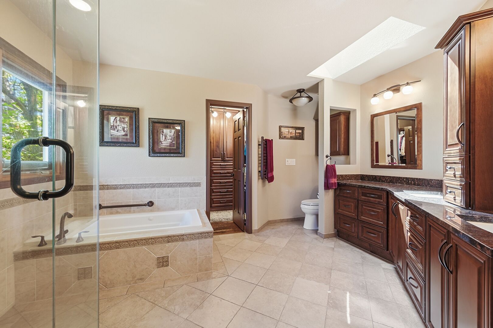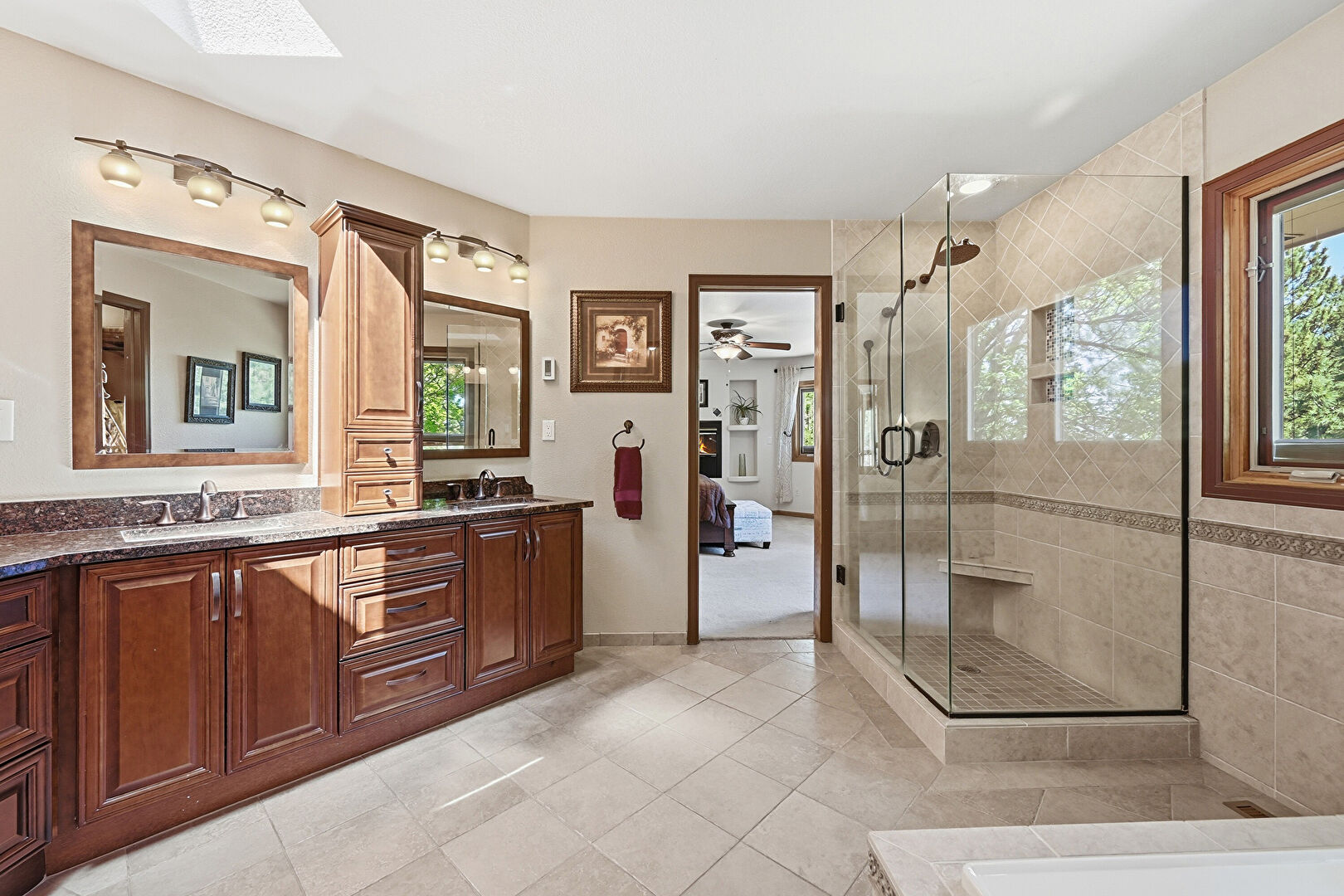 Baseboards Wall, Ceiling Fan, Drywall, Ensuite Bathroom, Full Bathroom, Natural Light, Skylight, Tile Floor, Vanity, Baseboards Wall, Double Vanity