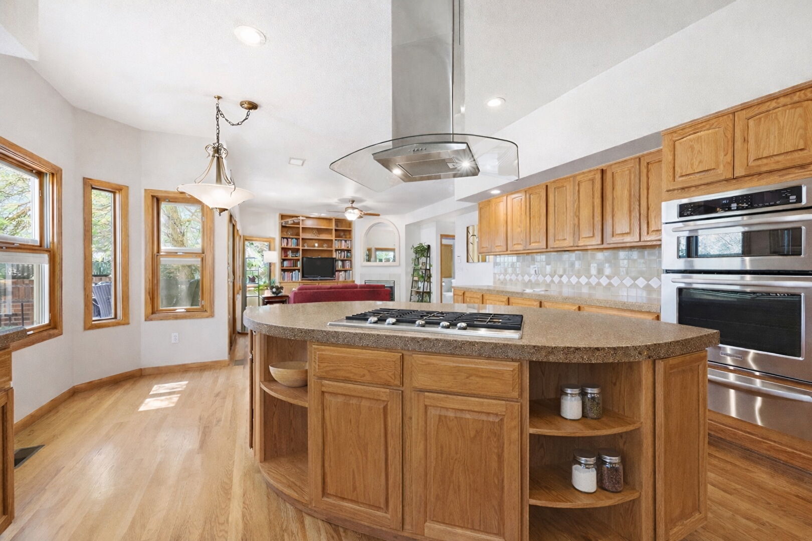 Butcher Block Countertops, Carpet, Drywall, Glass Insert Cabinets, Indoor Bar, Medium Brown Cabinets, Open Shelves, Recessed Lighting, Stairs, Vent, Baseboards Wall