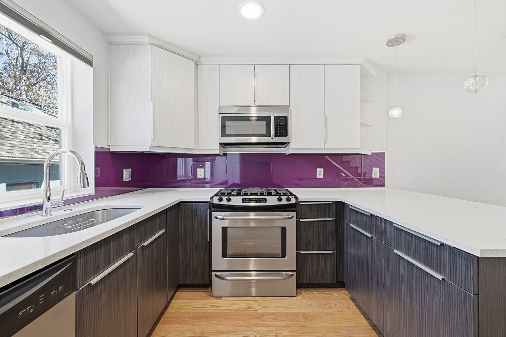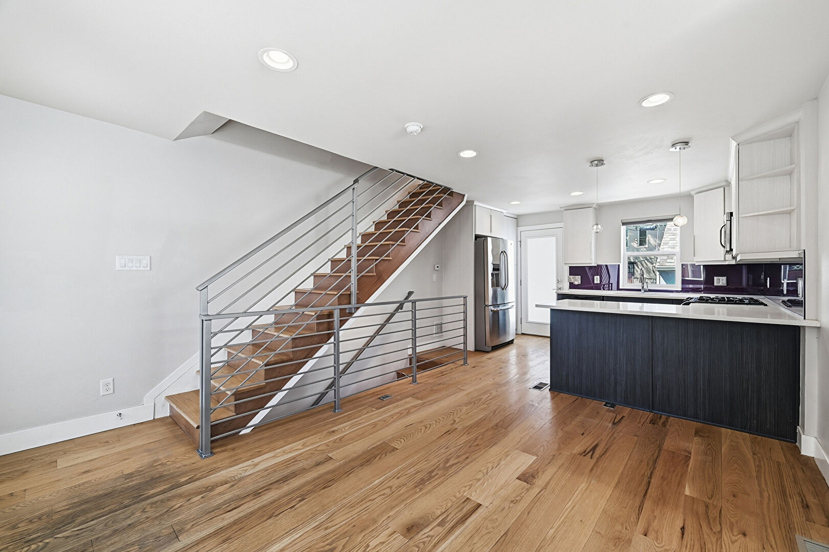 Baseboards Wall, Drywall, G Shaped Kitchen, Natural Light, Open Shelves, Pendant Lighting, Recessed Lighting, Shaker Cabinets, Stairs, Stone Countertops, Vent, Wood Finish Floor, Kitchen Peninsula, Smoke Carbon Monoxide Detector