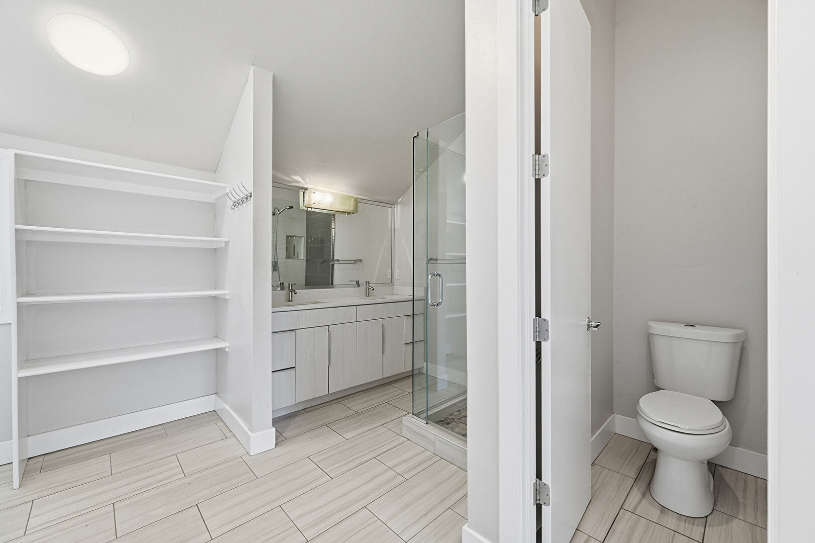 Closet, Double Vanity, Drywall, Full Bathroom, Water Closet, Wood Finish Floor, Baseboards Wall, Double Vanity