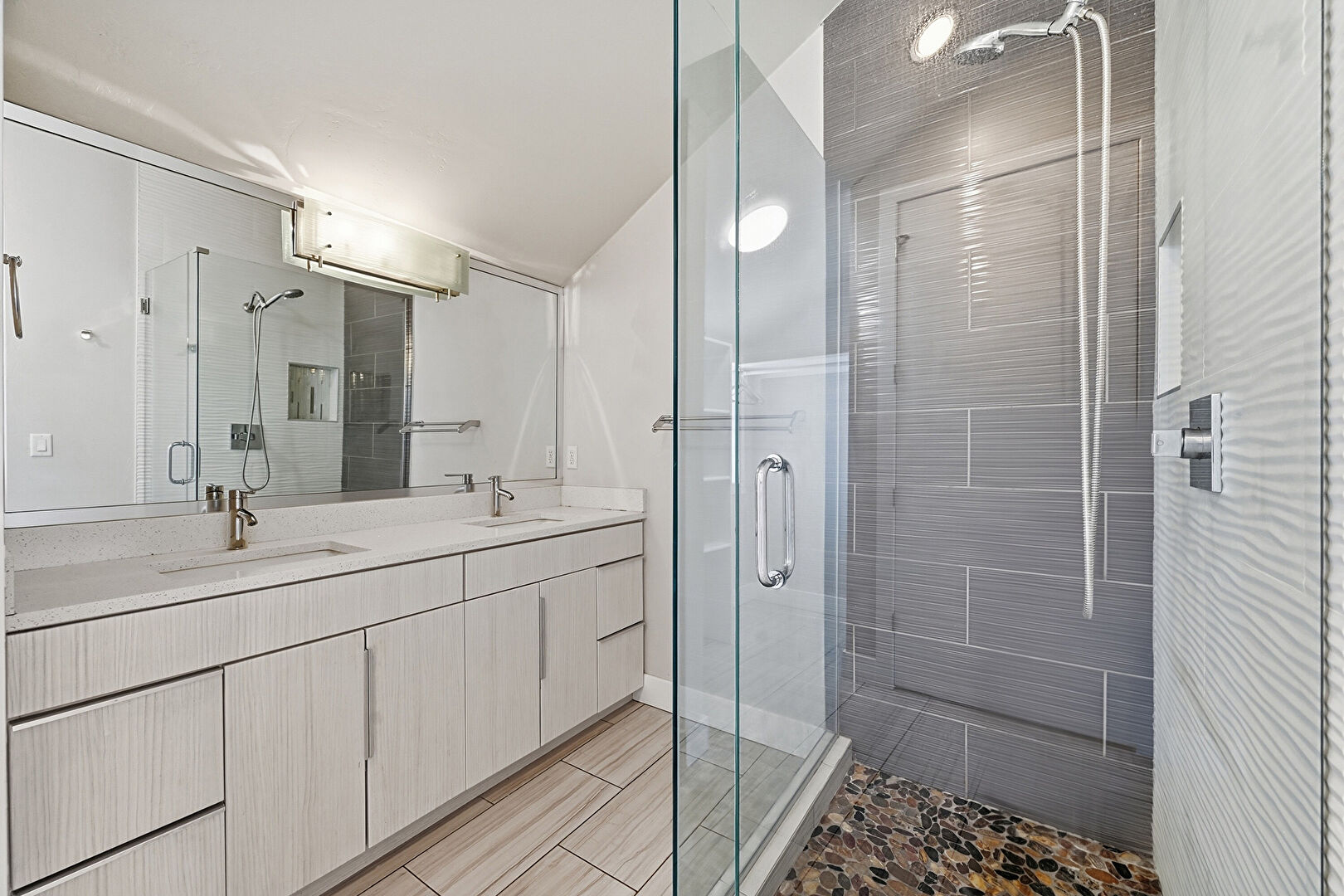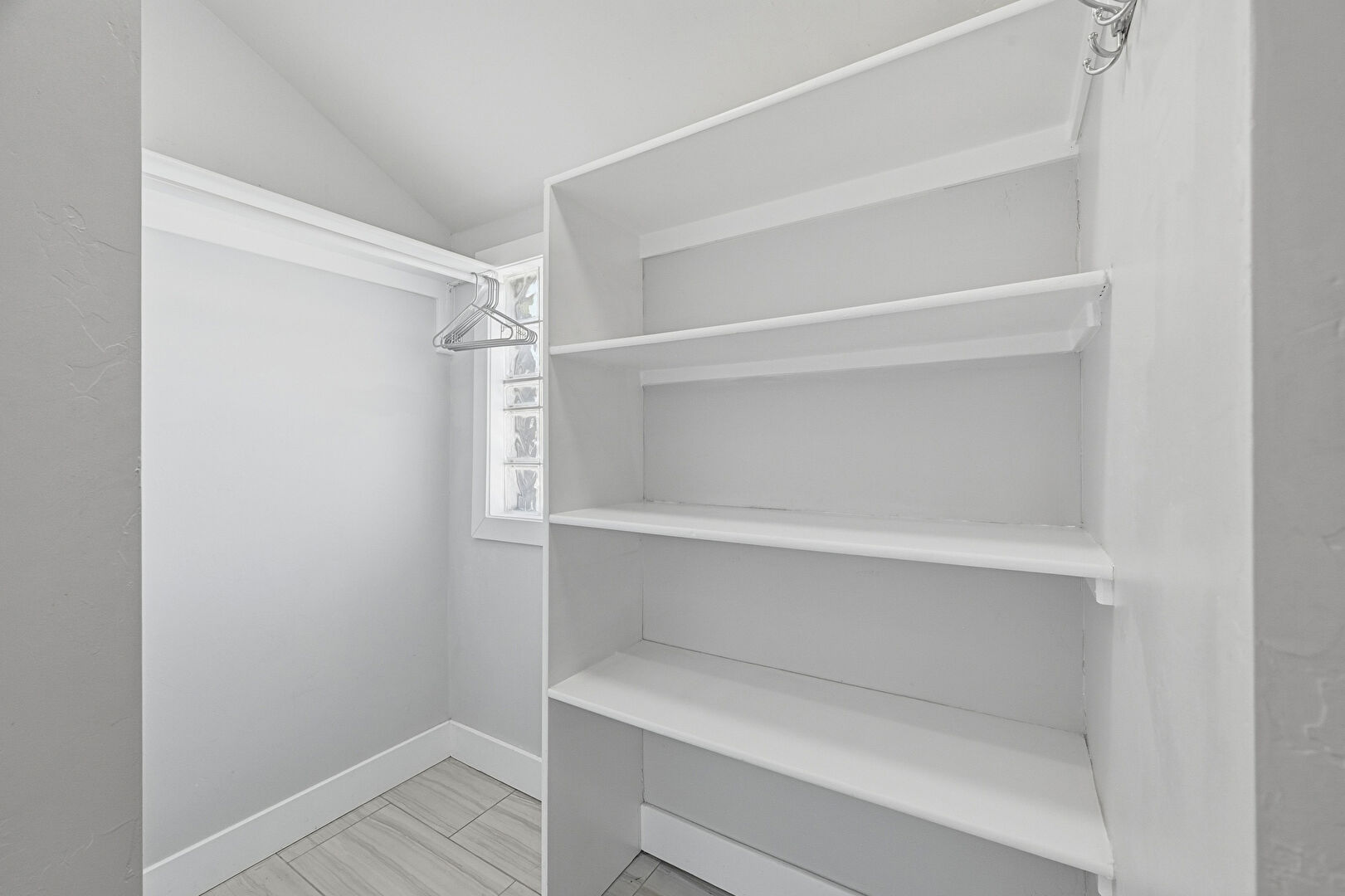 Baseboards Wall, Closet, Combined Bath Shower, Drywall, Full Bathroom, Laundry, Vanity, Vent, Tile Floor