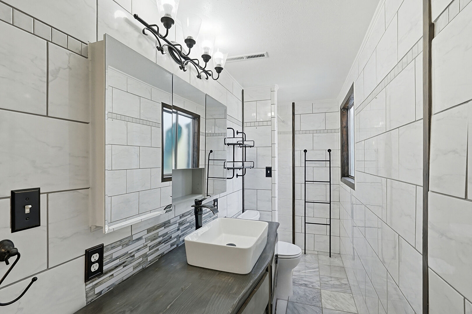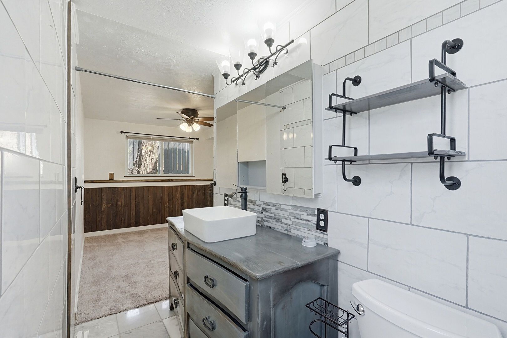 Carpet, Ceiling Fan, Drywall, Full Bathroom, Natural Light, Tile Floor, Tile Wall, Vanity, Full Bathroom, Half Bathroom, Vent