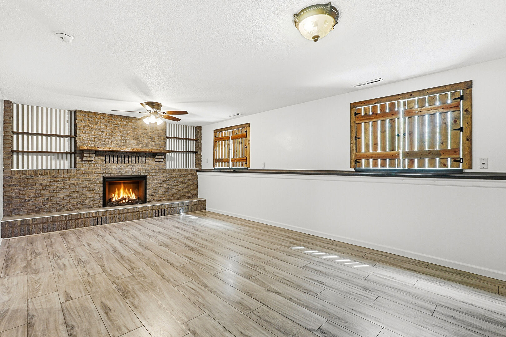 Baseboards Wall, Brick Wall, Ceiling Fan, Drywall, Fireplace, Natural Light, Smoke Carbon Monoxide Detector, Stairs, Textured Ceiling, Vent, Wood Finish Floor, Smoke Carbon Monoxide Detector, Wood Finish Floor