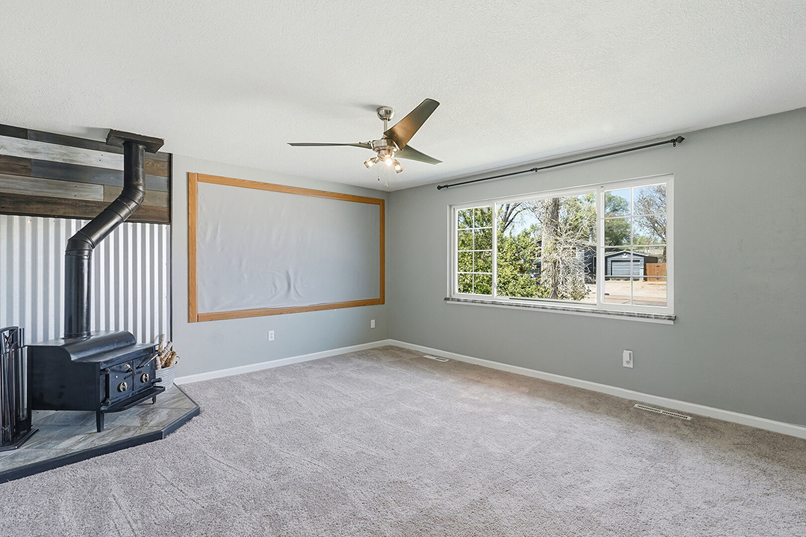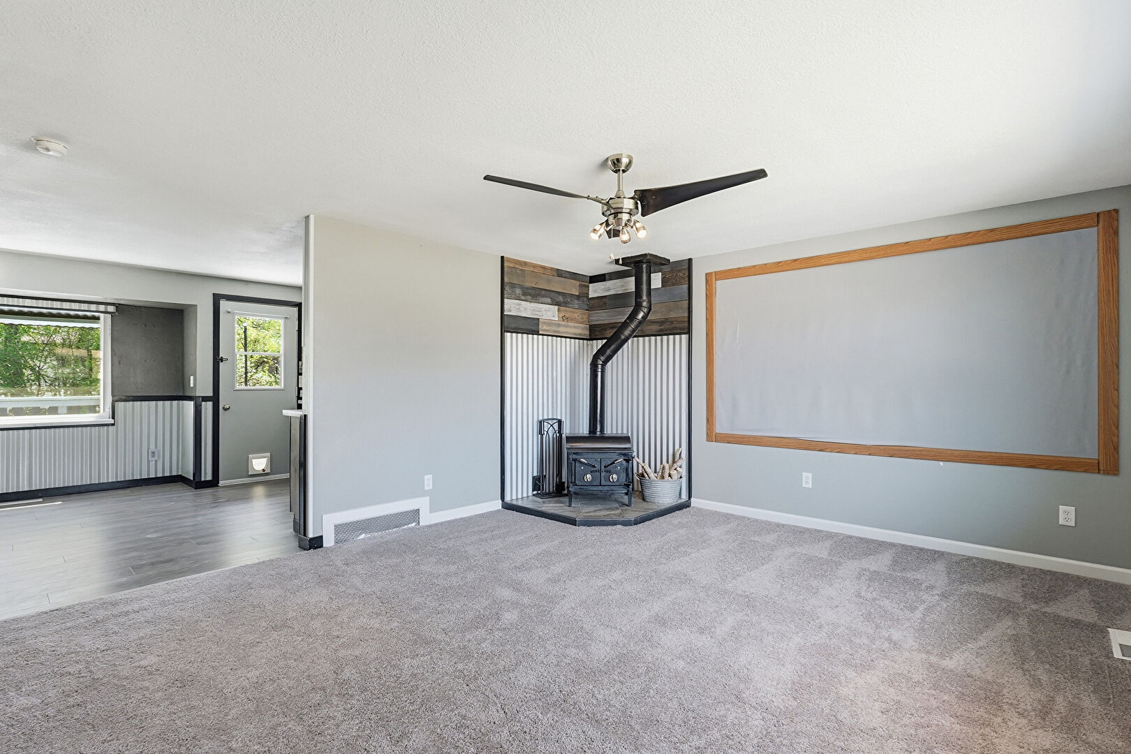 Accent Wall, Baseboards Wall, Carpet, Ceiling Fan, Drywall, Natural Light, Smoke Carbon Monoxide Detector, Stairs, Vent, Wood Stove, Wood Wall, Baseboards Wall, Carpet, Textured Ceiling