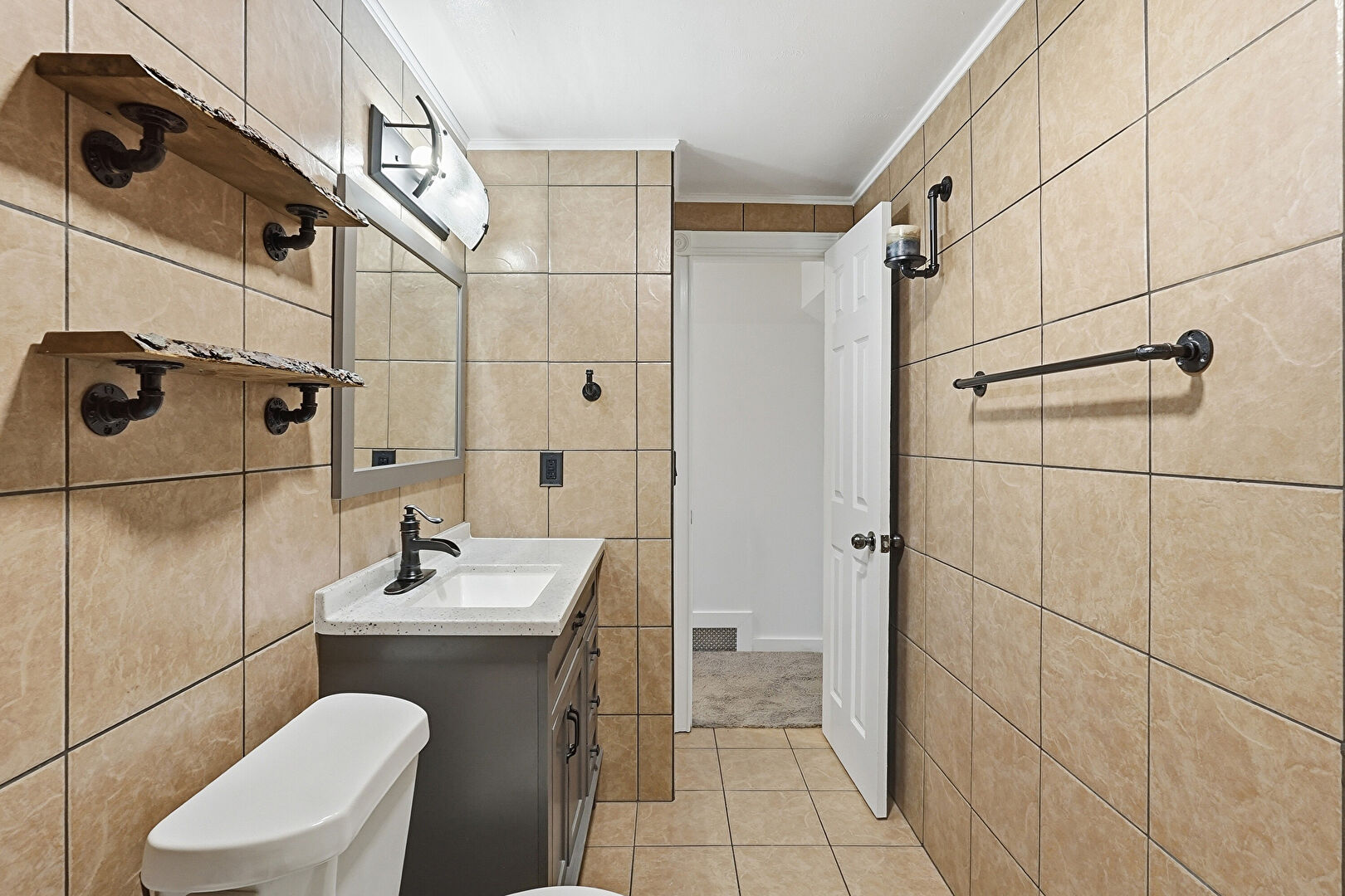 Combined Bath Shower, Crown Molding, Tile Floor, Tile Wall, Vanity, Full Bathroom, Half Bathroom