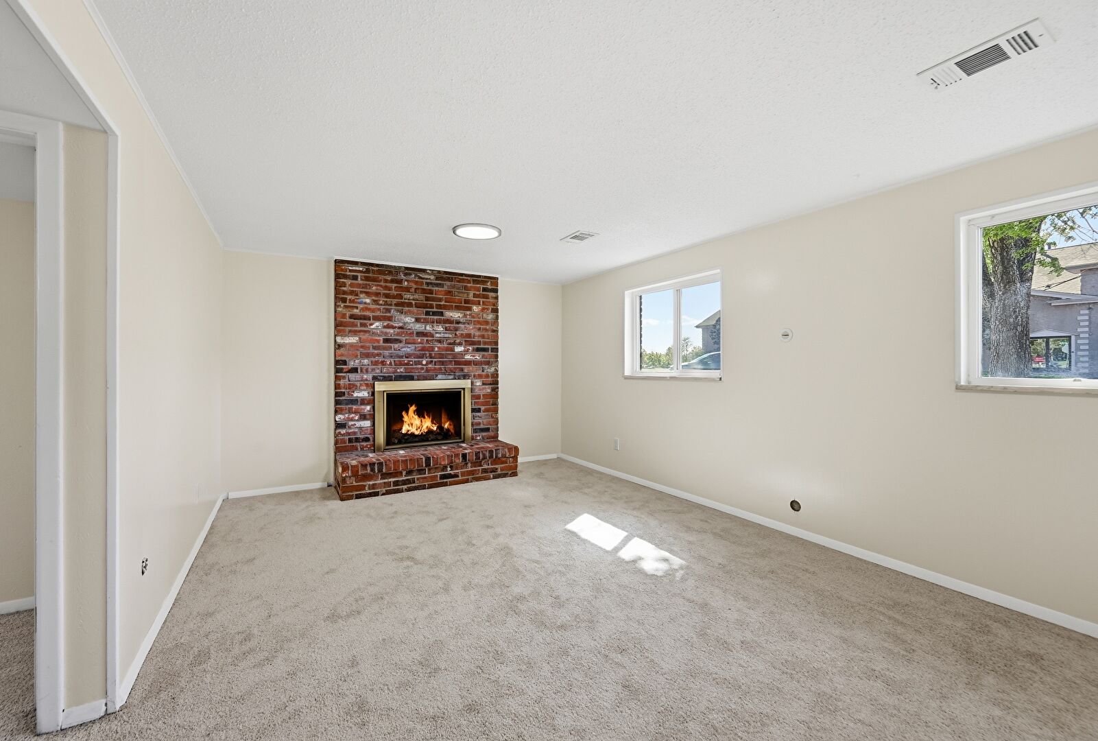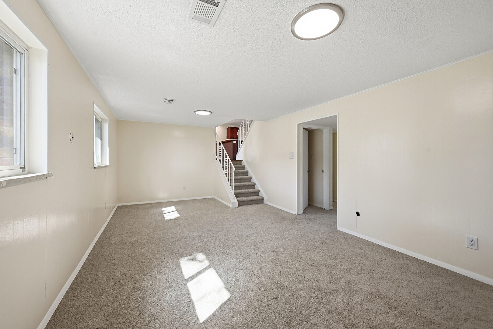 Baseboards Wall, Carpet, Drywall, Natural Light, Stairs, Textured Ceiling, Vent, Baseboards Wall, Fireplace