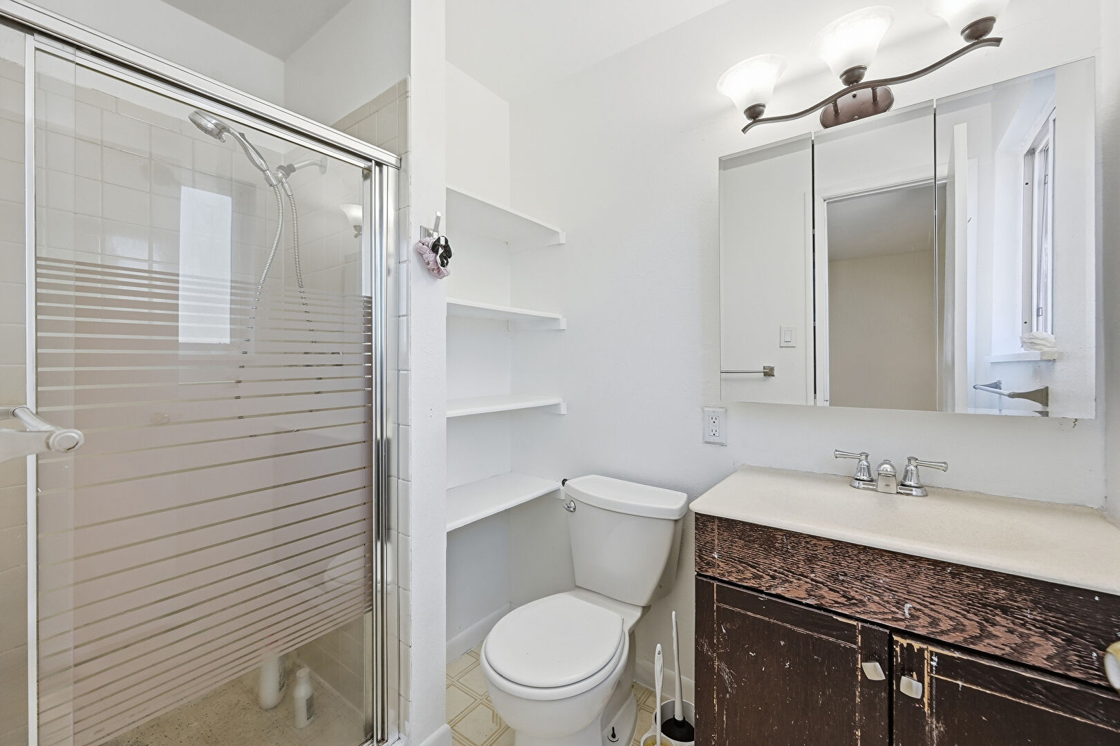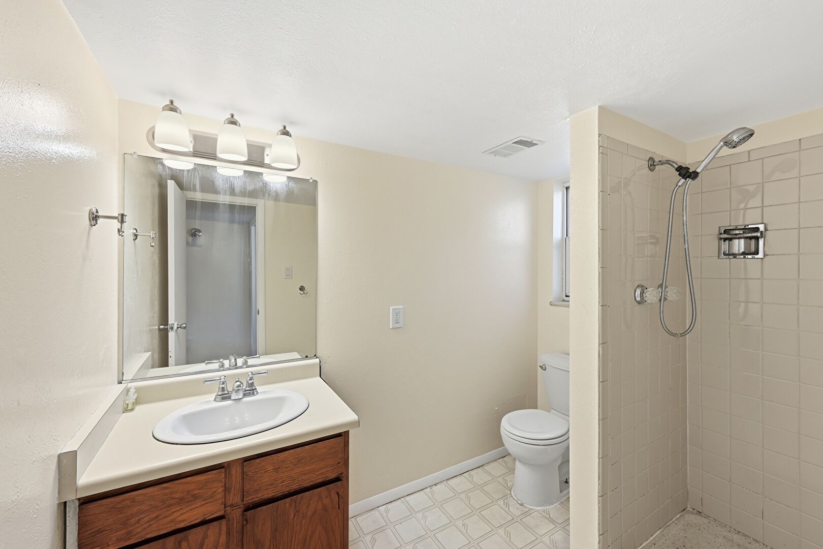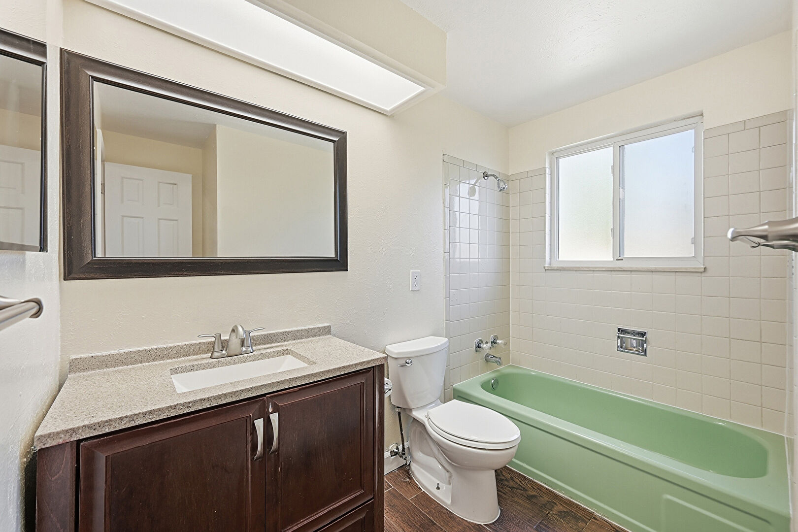 Combined Bath Shower, Drywall, Full Bathroom, Natural Light, Vanity, Vent, Vinyl Floor, Wood Finish Floor, Baseboards Wall, Vanity