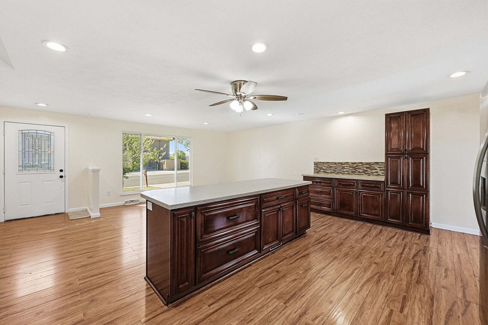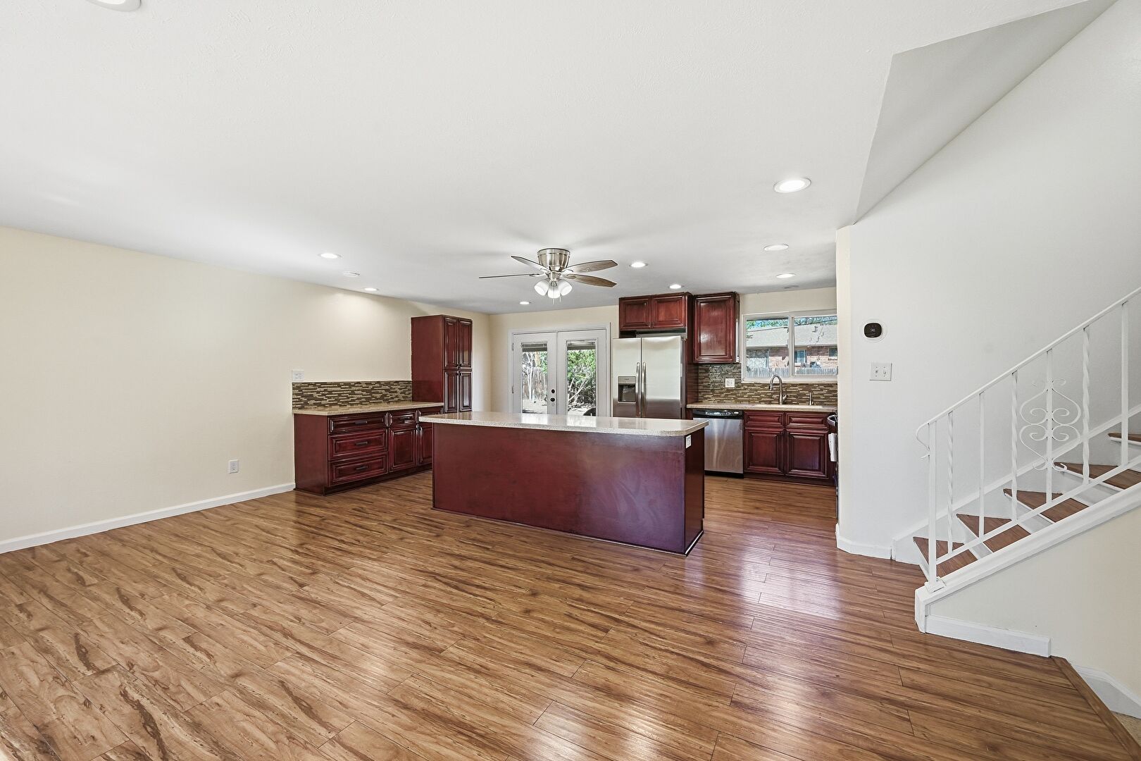 Baseboards Wall, Ceiling Fan, Drywall, French Doors, Kitchen Bar, Kitchen Island, Natural Light, Opens To Living Area, Raised Cabinets, Recessed Lighting, Reddish Brown Cabinets, Shaker Cabinets, Vent, Wood Finish Floor, Natural Light, Recessed Lighting, Stone Countertops