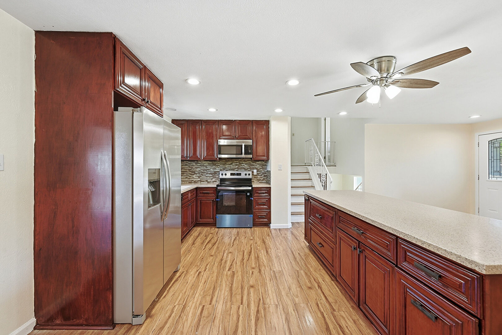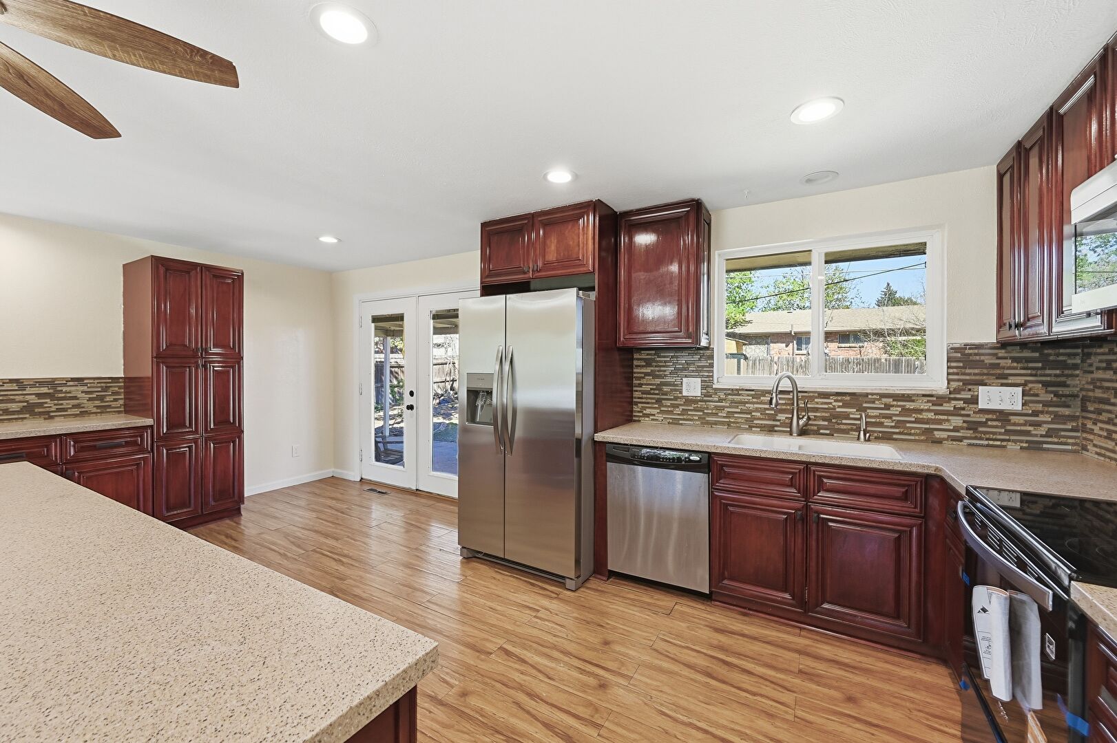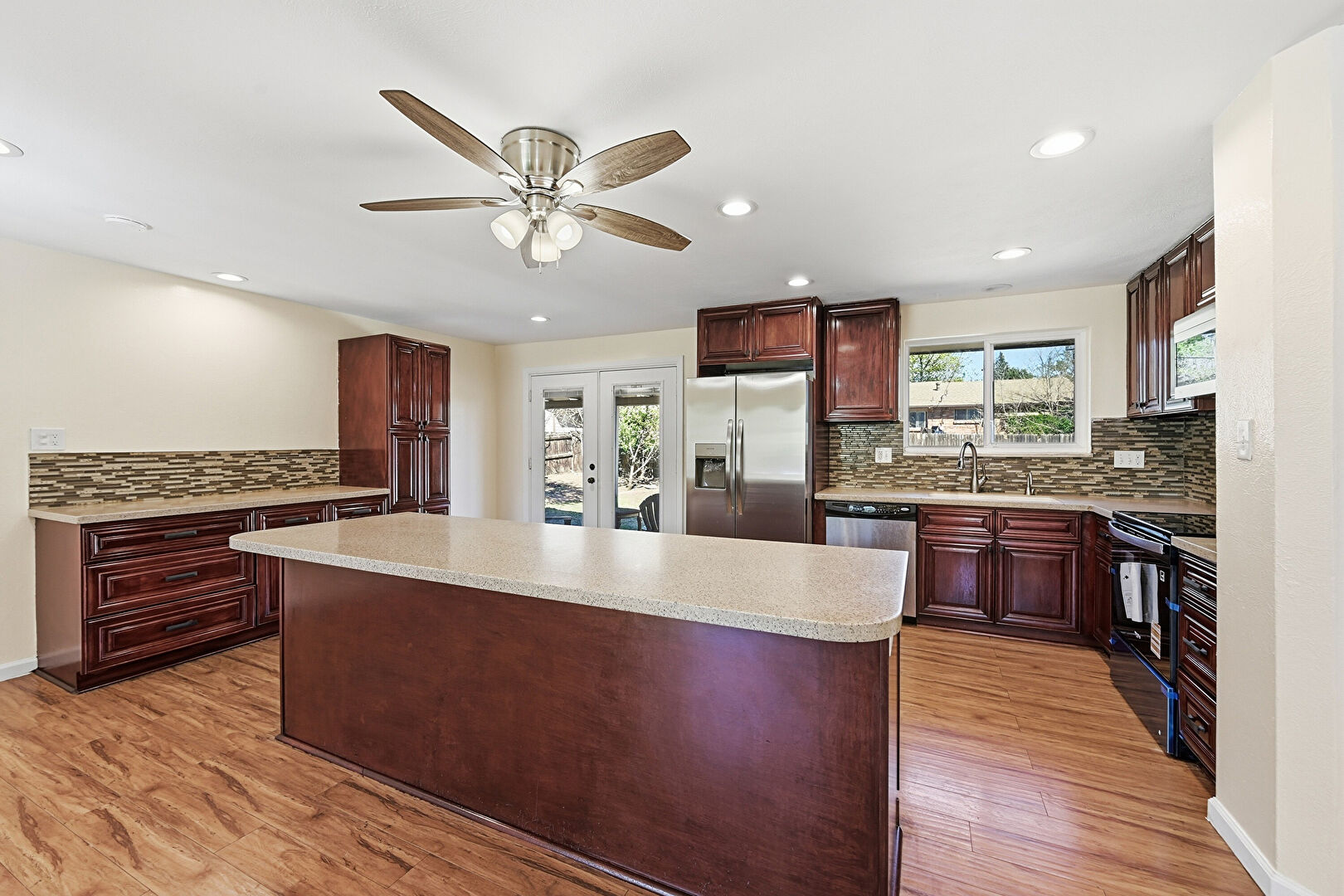 Baseboards Wall, Ceiling Fan, Dark Brown Cabinets, Drywall, French Doors, Kitchen Island, L Shaped Kitchen, Natural Light, Raised Cabinets, Recessed Lighting, Reddish Brown Cabinets, Stone Countertops, U Shaped Kitchen, Wood Finish Floor, Kitchen Island, Natural Light, Raised Cabinets