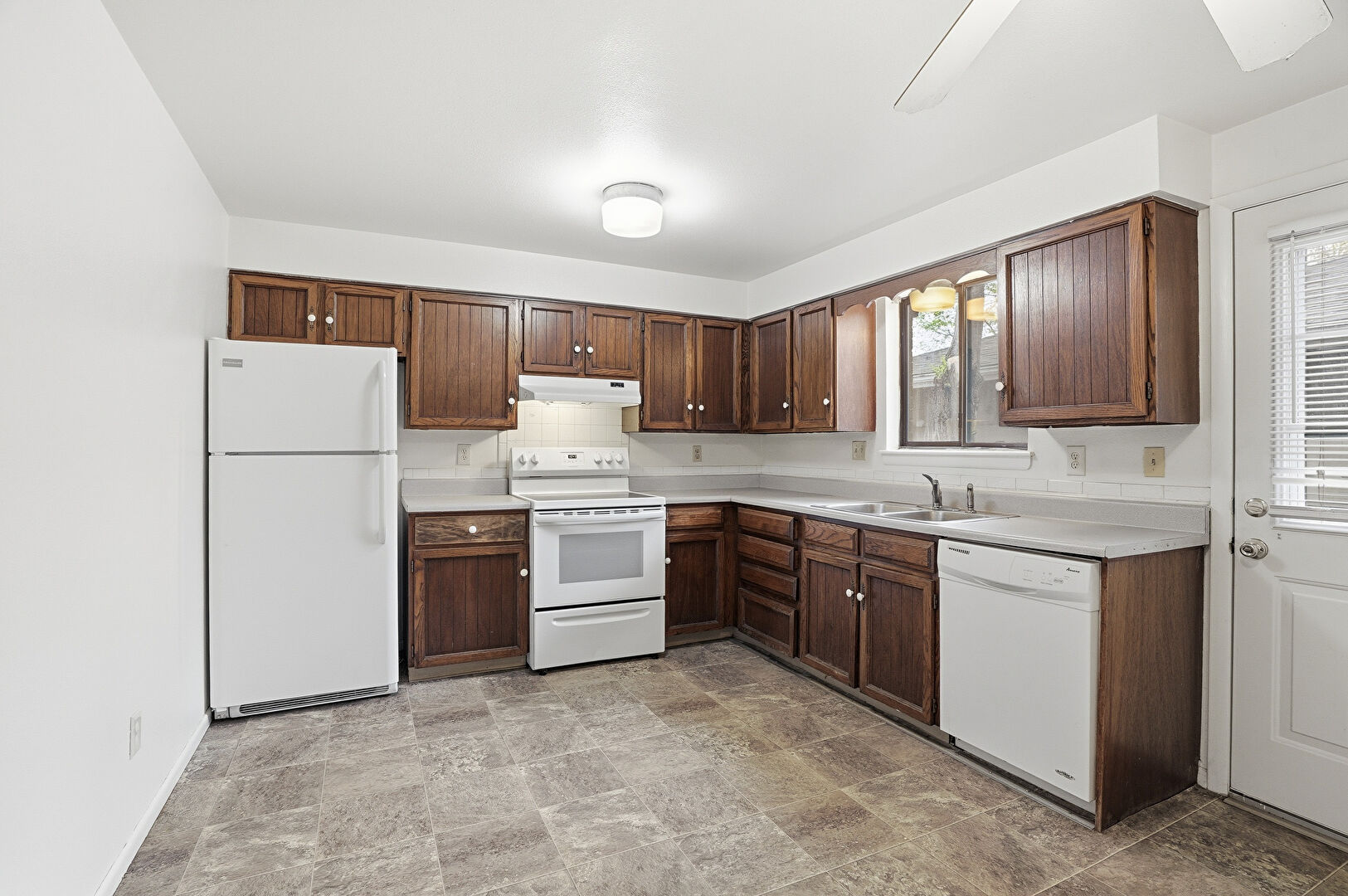 Baseboards Wall, Carpet, Ceiling Fan, Dark Brown Cabinets, Drywall, L Shaped Kitchen, Medium Brown Cabinets, Natural Light, Shaker Cabinets, Stone Finish Floor, Textured Ceiling, Visible Hinge Cabinets, Dark Brown Cabinets, Shaker Cabinets, Vent, Visible Hinge Cabinets