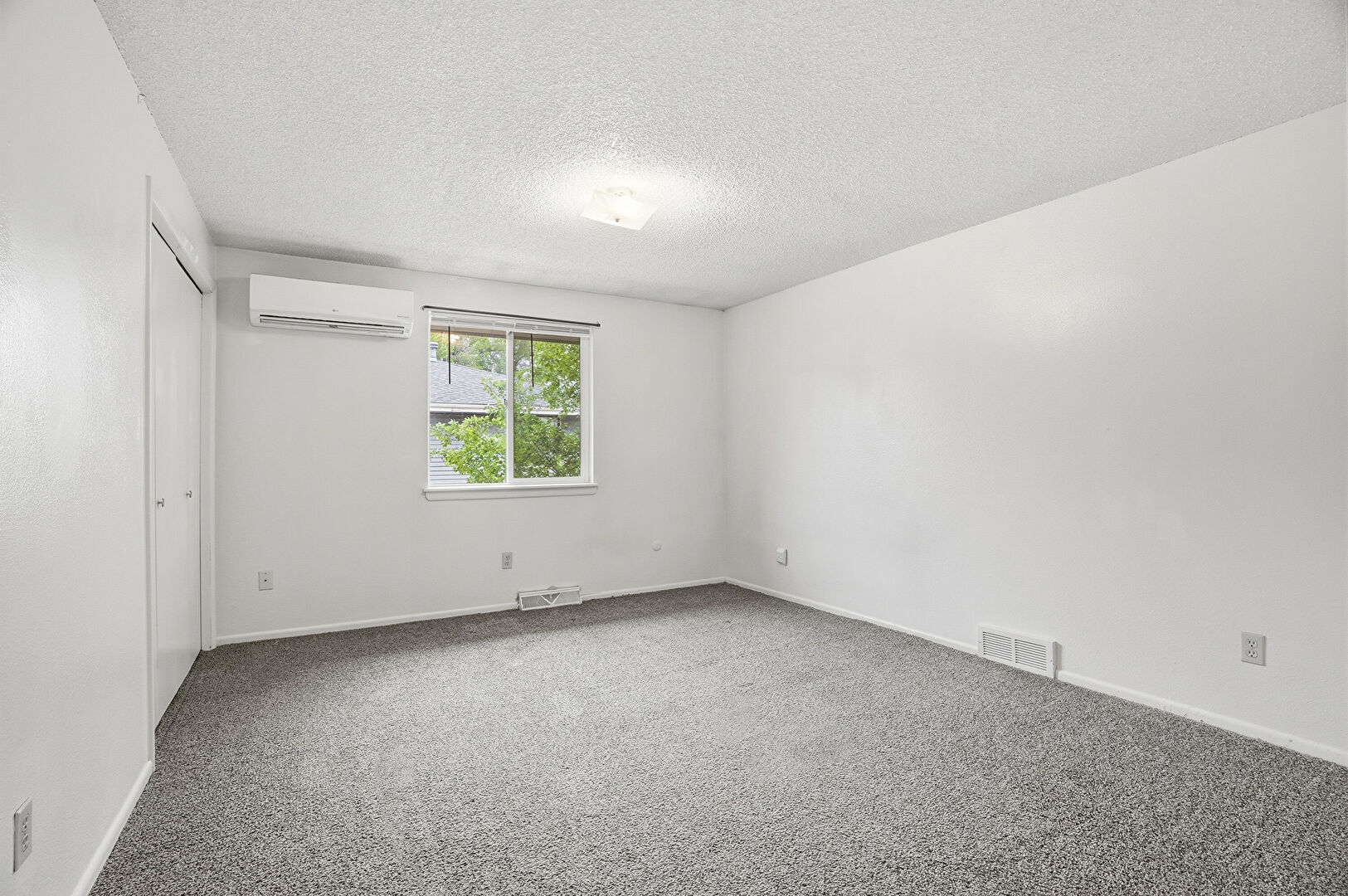 Baseboards Wall, Carpet, Closet, Drywall, Textured Ceiling, Vent, Wall Mounted Ac, Carpet, Natural Light