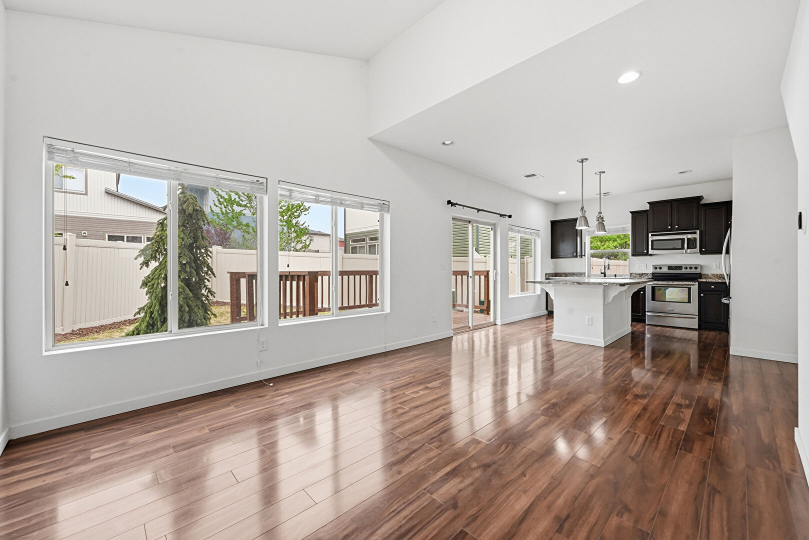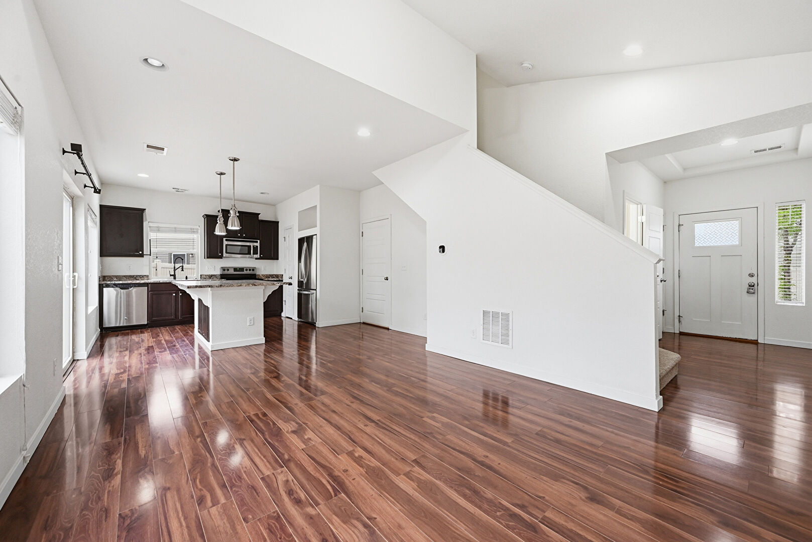 Barn Door, Baseboards Wall, Drywall, L Shaped Kitchen, Natural Light, Recessed Lighting, Vent, Wood Finish Floor, High Ceiling, Stairs