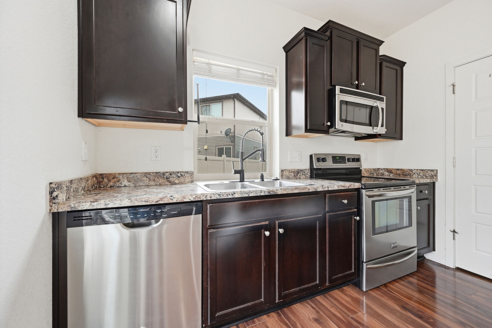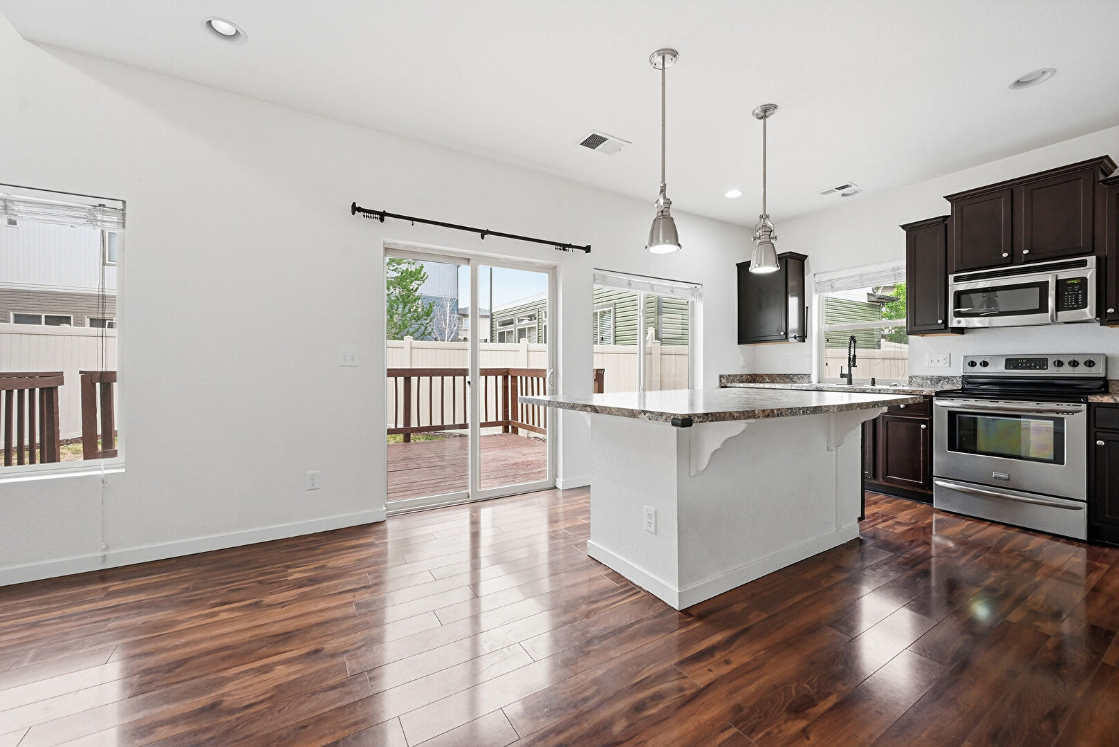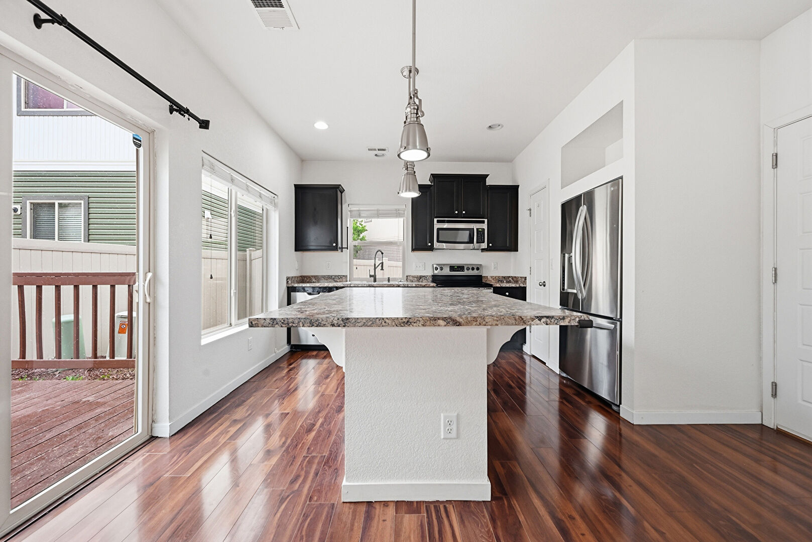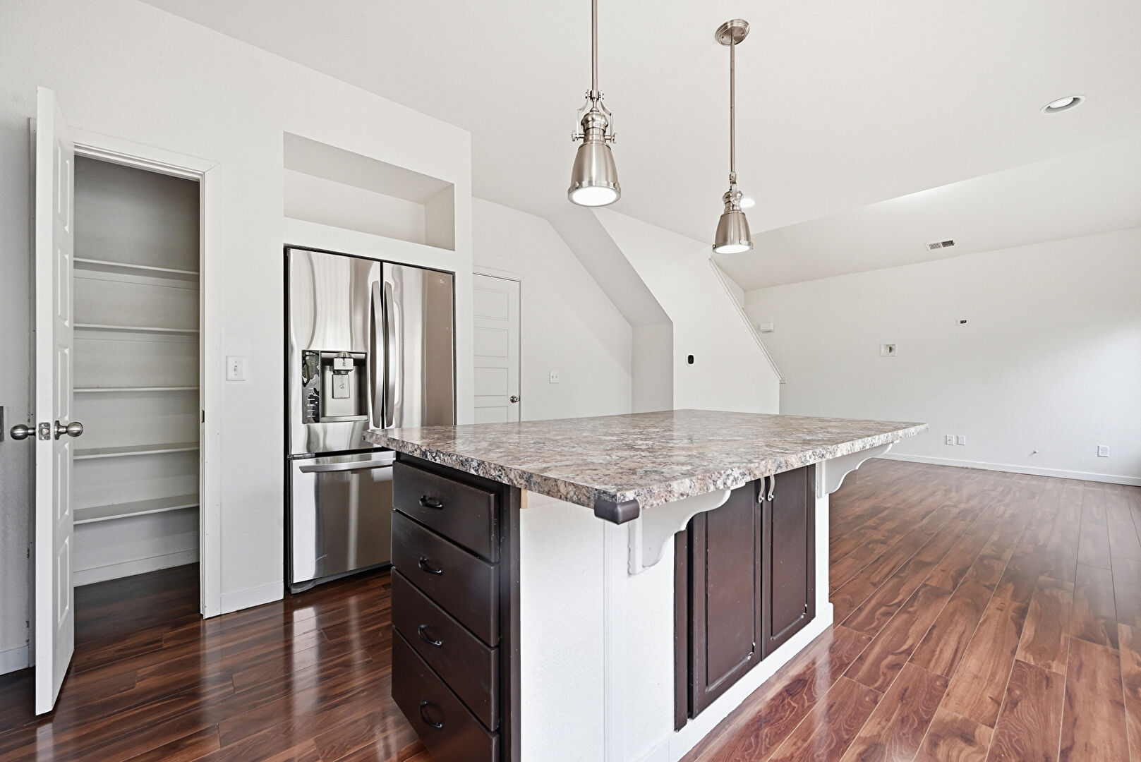 Baseboards Wall, Black Cabinets, Crown Molding Cabinets, Dark Brown Cabinets, Drywall, Kitchen Bar, Kitchen Island, L Shaped Kitchen, Natural Light, Opens To Living Area, Pendant Lighting, Recessed Lighting, Shaker Cabinets, Stone Countertops, Vaulted Ceiling, Vent, Wood Finish Floor, Crown Molding Cabinets, Dark Brown Cabinets, Recessed Lighting, Wood Finish Floor