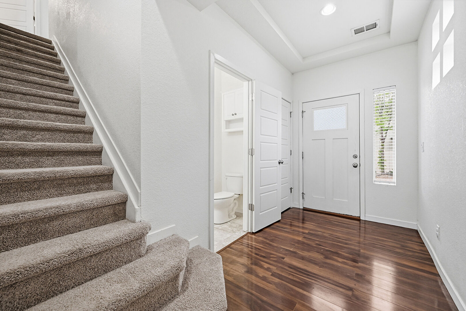 Baseboards Wall, Natural Light, Recessed Lighting, Stairs, Textured Wall, Tray Ceiling, Vent, Wood Finish Floor