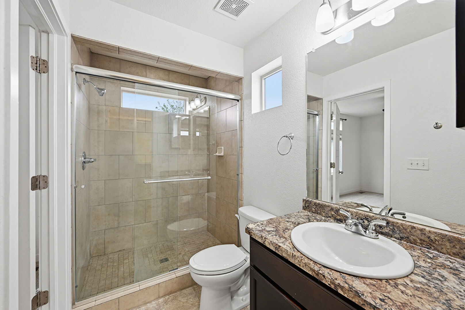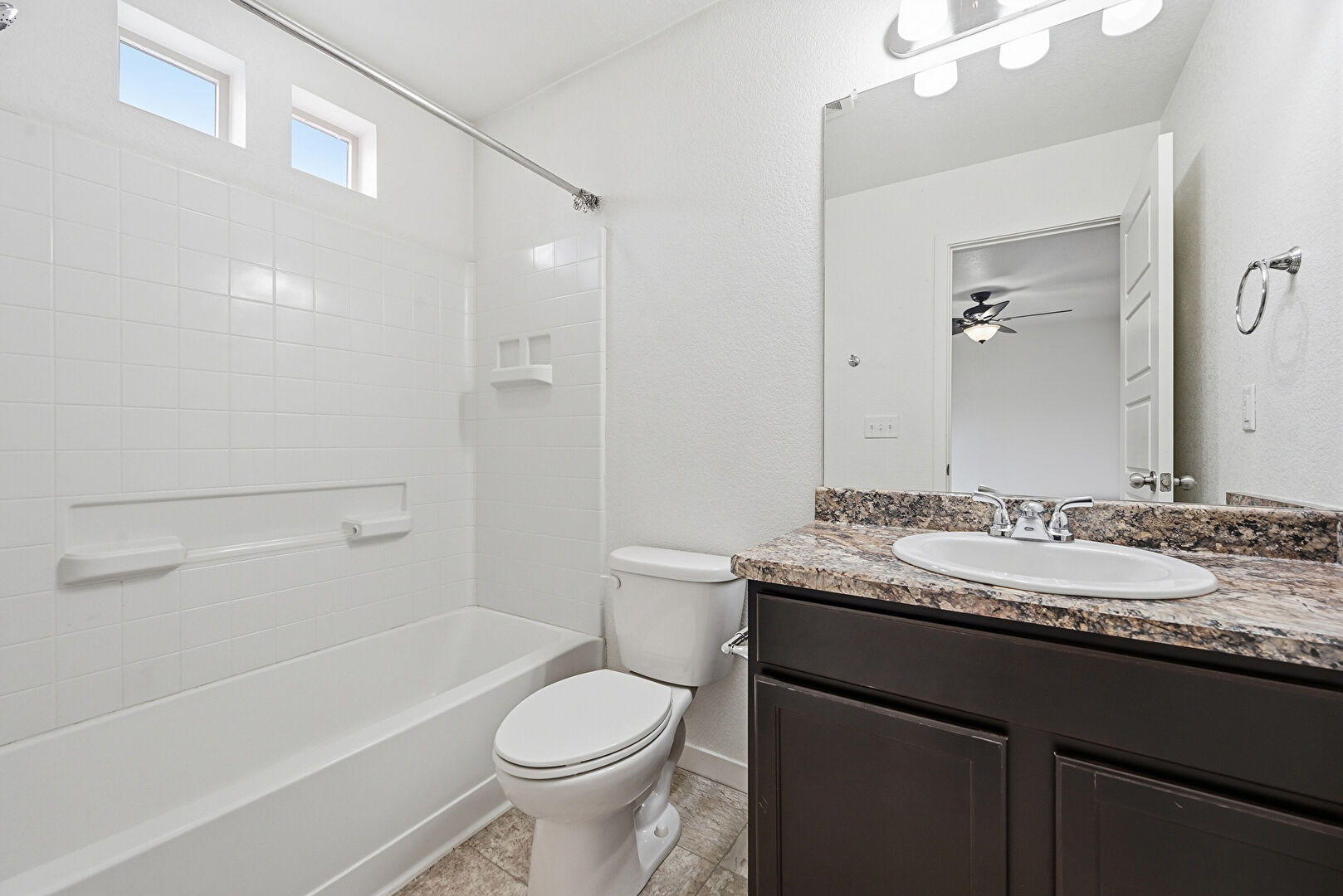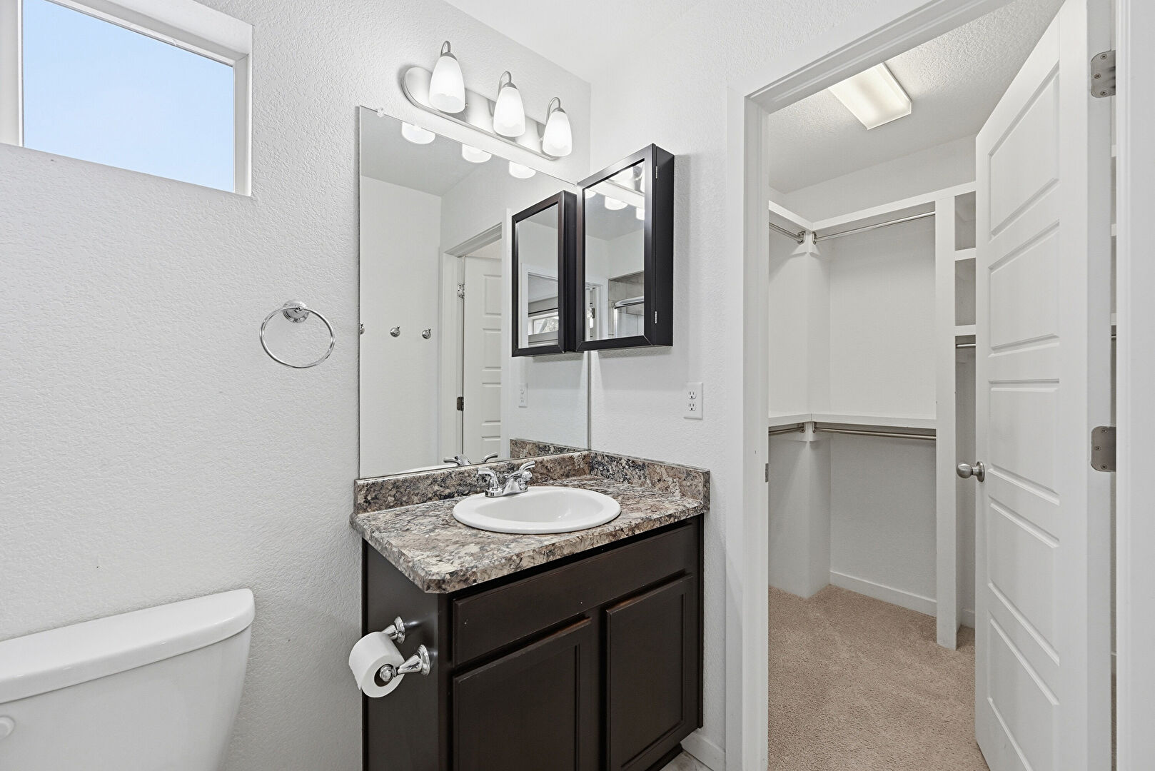 Baseboards Wall, Carpet, Ceiling Fan, Combined Bath Shower, Full Bathroom, Half Bathroom, Natural Light, Textured Wall, Tile Floor, Vanity, Vent, Baseboards Wall, Natural Light, Walk In Closet
