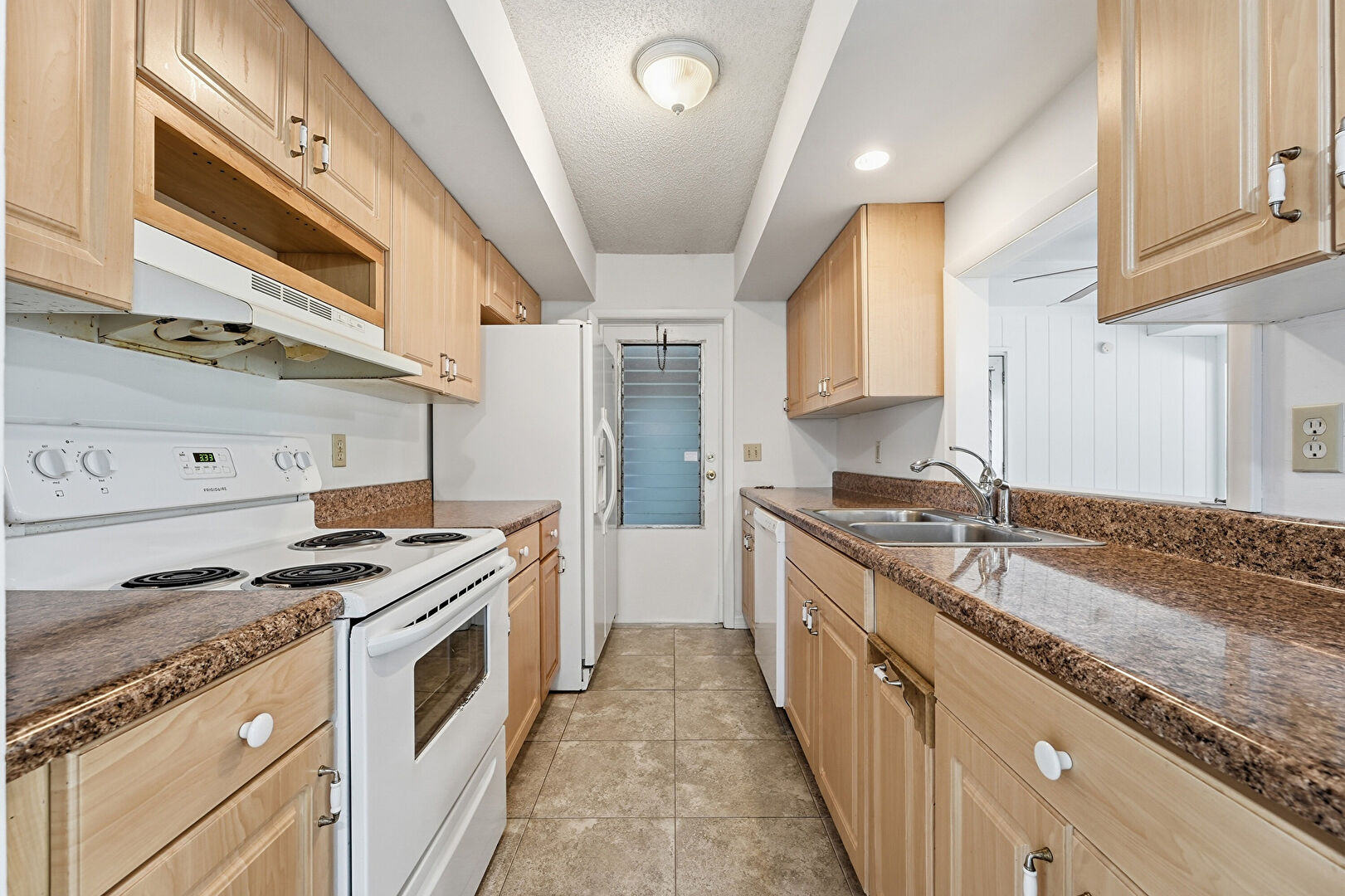 Drywall, Raised Cabinets, Stone Countertops, Textured Ceiling, Tile Floor, Recessed Lighting