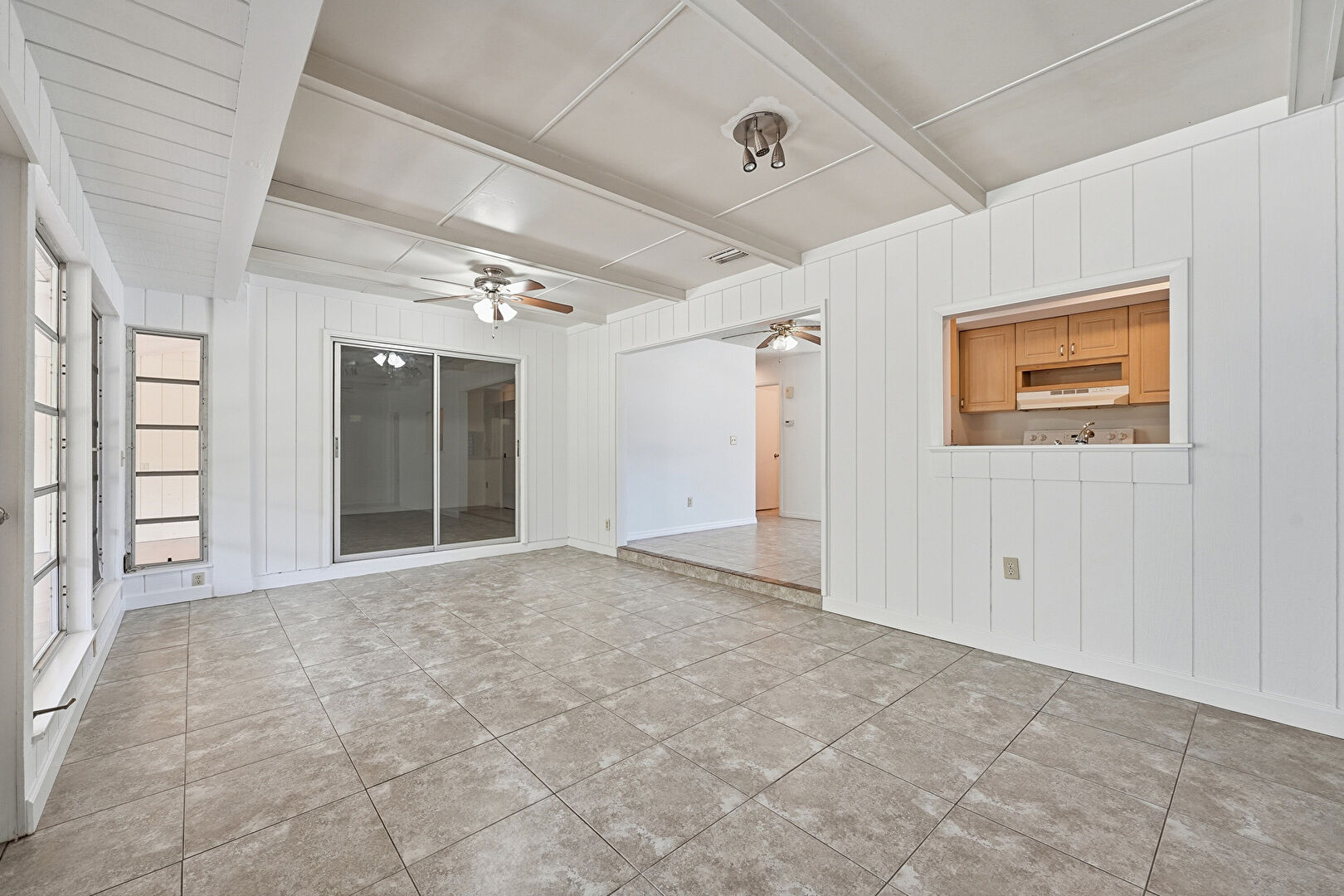 Baseboards Wall, Beamed Ceiling, Natural Light, Sunroom, Tile Floor, Vent, Wood Wall, Ceiling Fan