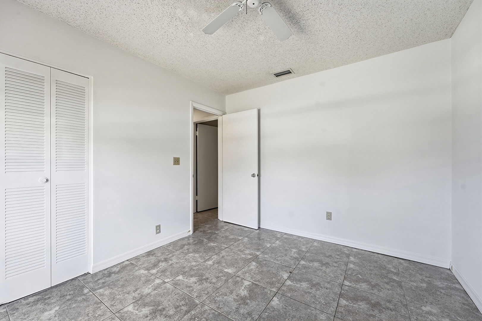 Baseboards Wall, Ceiling Fan, Closet, Drywall, Natural Light, Textured Ceiling, Tile Floor, Vent, Ceiling Fan, Textured Ceiling