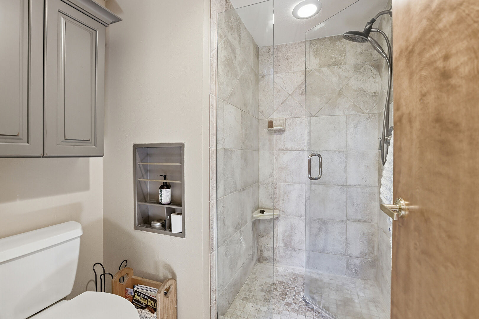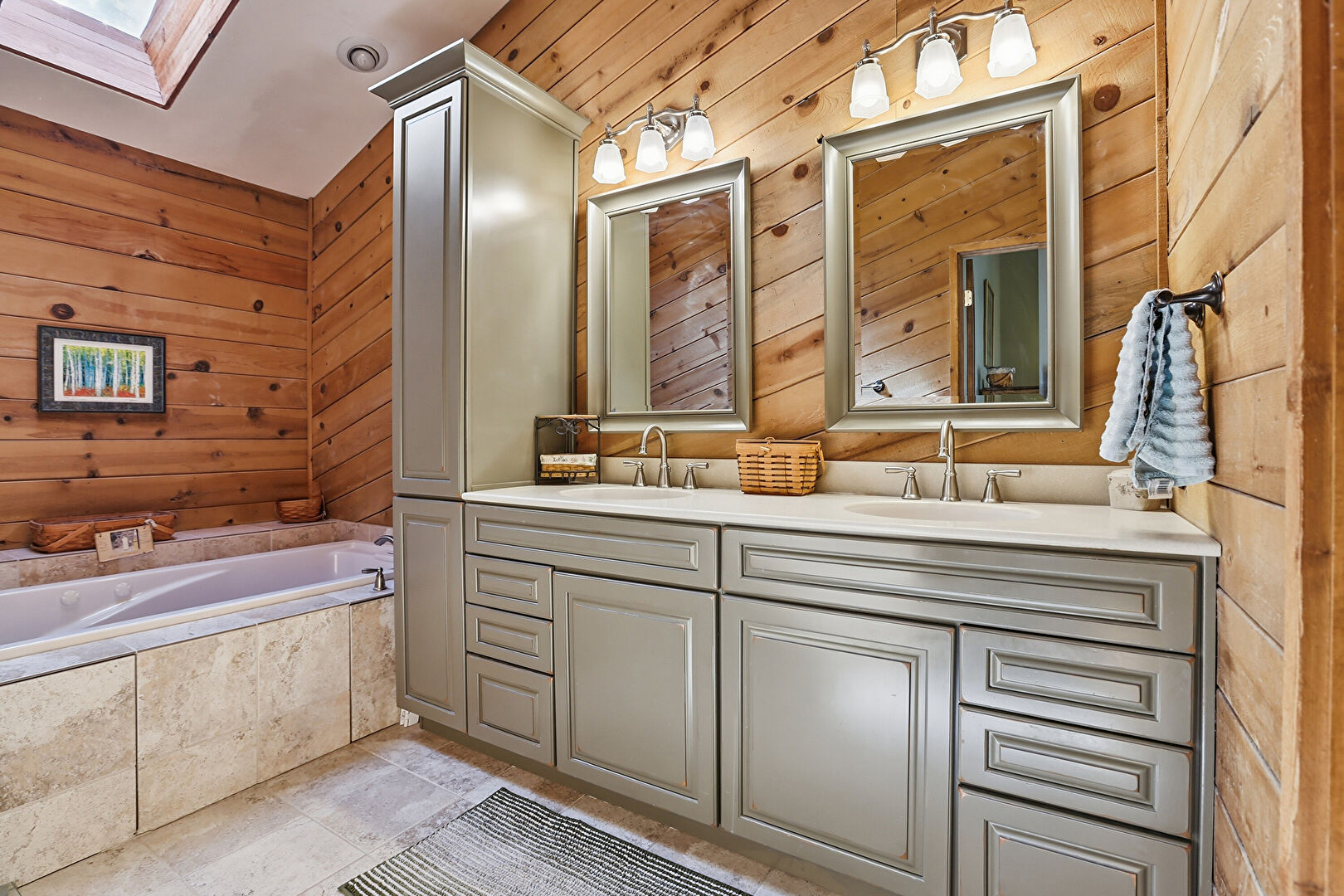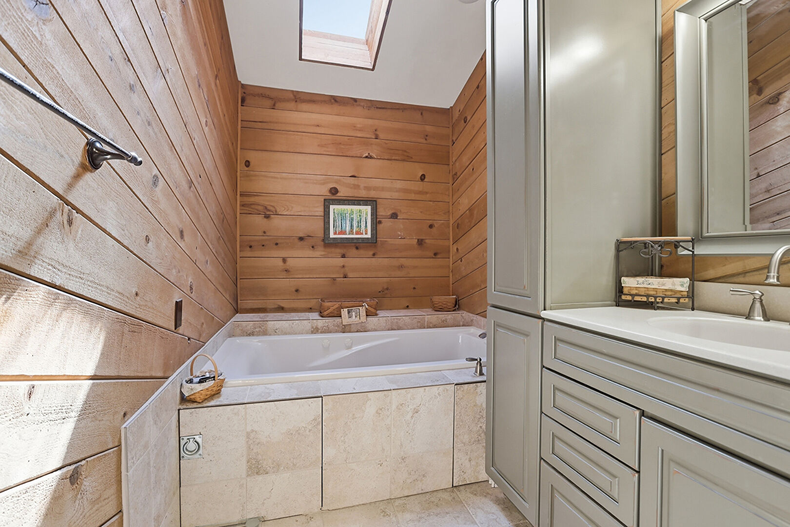 Baseboards Wall, Built In Shelves, Drywall, Full Bathroom, Recessed Lighting, Skylight, Textured Wall, Tile Floor, Vanity, Vent, Wood Wall, Double Vanity, Drywall, Half Bathroom, Skylight, Textured Wall, Tile Floor