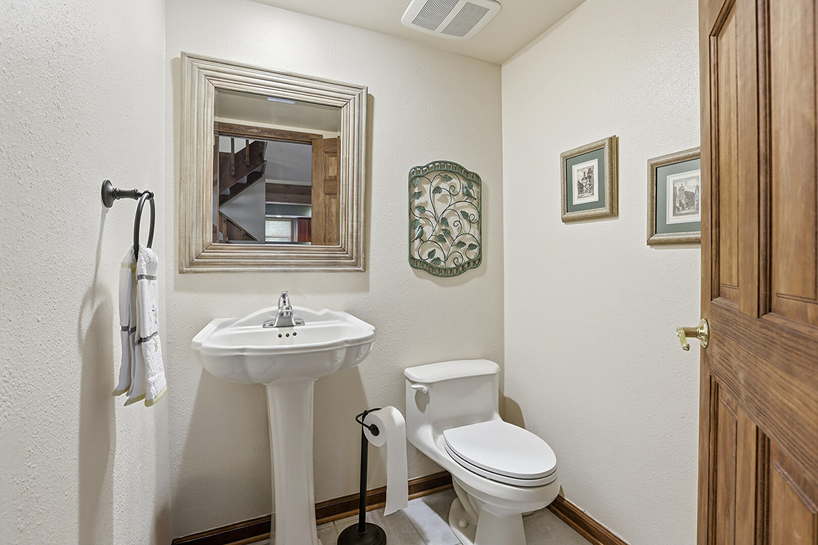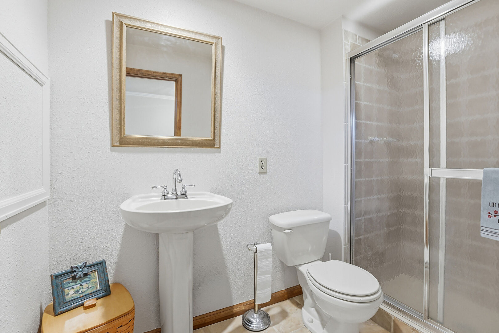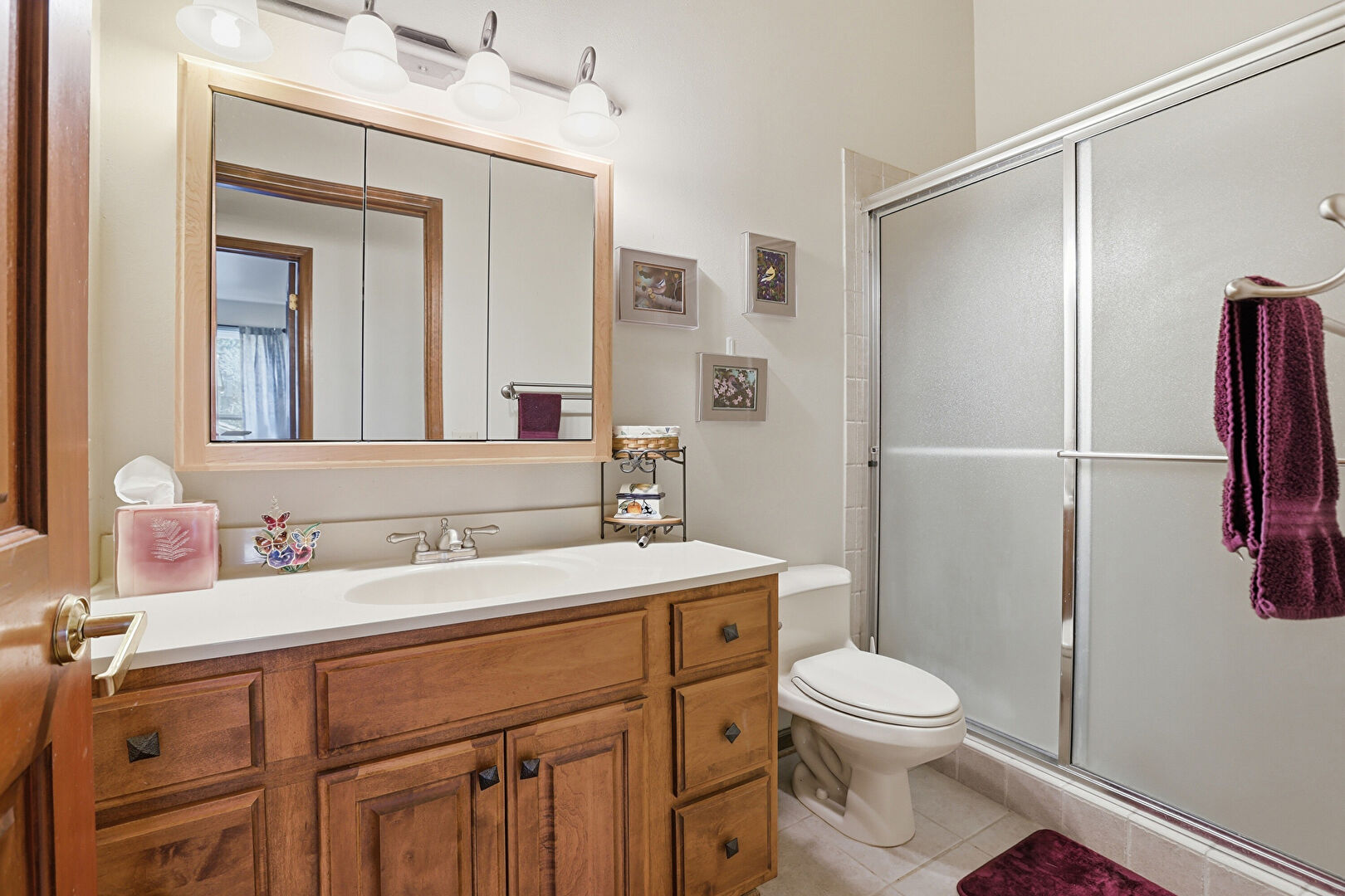 Baseboards Wall, Built In Shelves, Drywall, Full Bathroom, Recessed Lighting, Skylight, Textured Wall, Tile Floor, Vanity, Vent, Wood Wall, Double Vanity, Drywall, Half Bathroom, Skylight, Textured Wall, Tile Floor