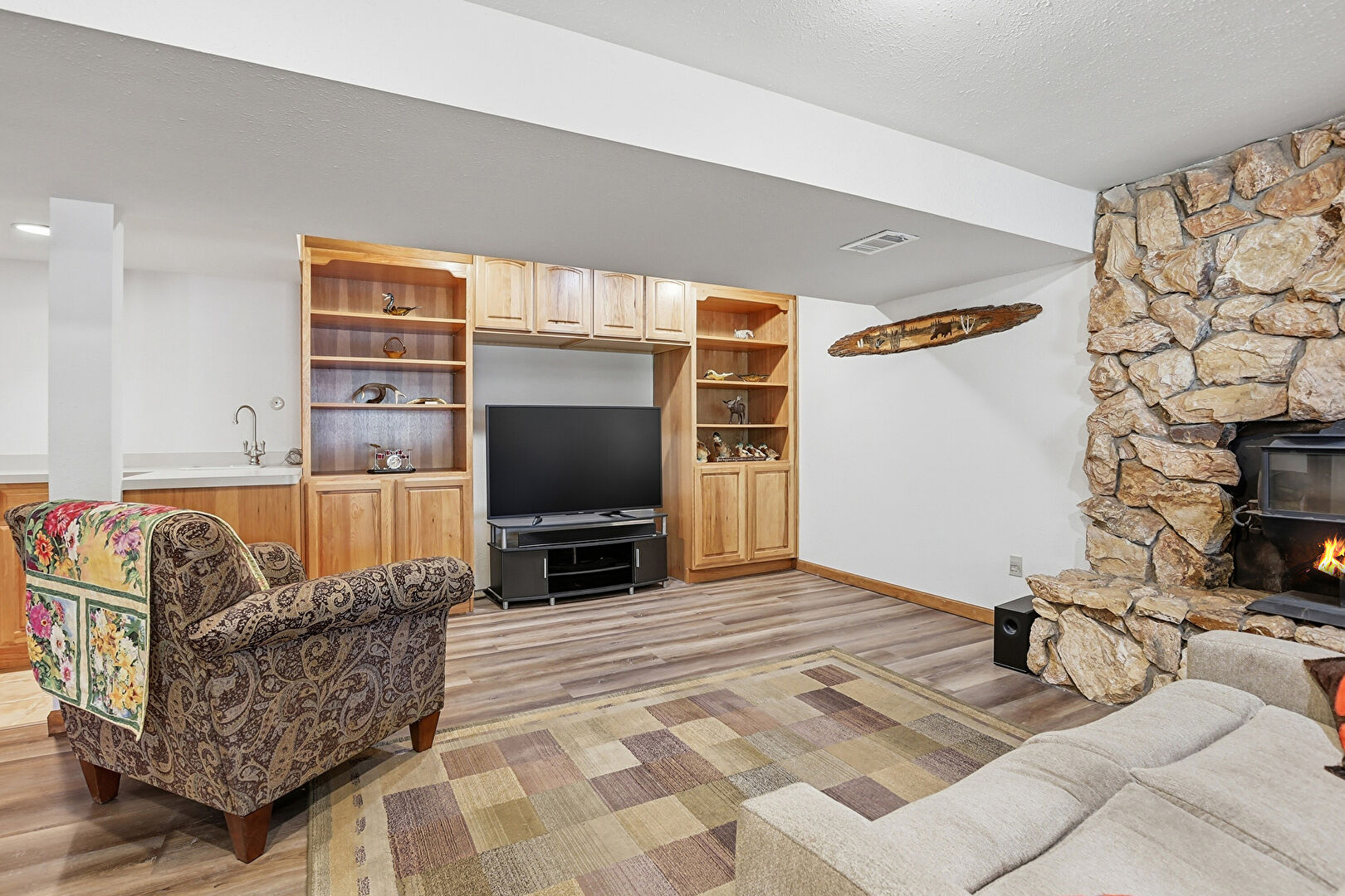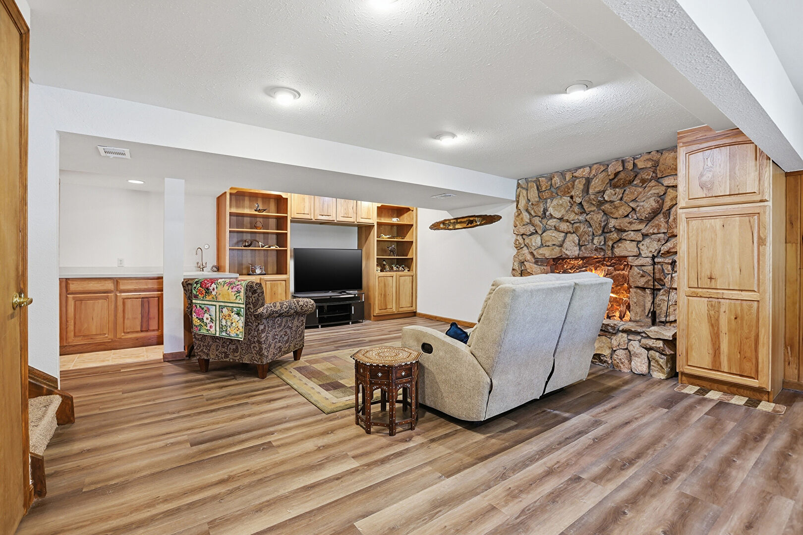 Baseboards Wall, Basement, Beamed Ceiling, Built In Shelves, Ceiling Fan, Drywall, Fireplace, Natural Light, Recessed Lighting, Stairs, Textured Ceiling, Vent, Wood Finish Floor, Wood Wall, Billiards, Ceiling Fan, Recessed Lighting, Vent, Wood Wall