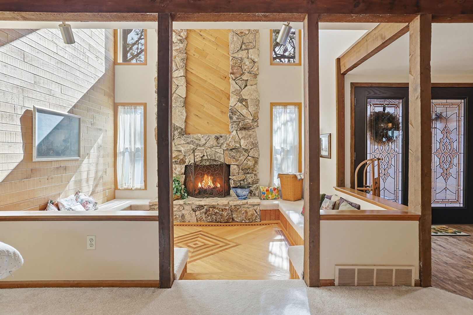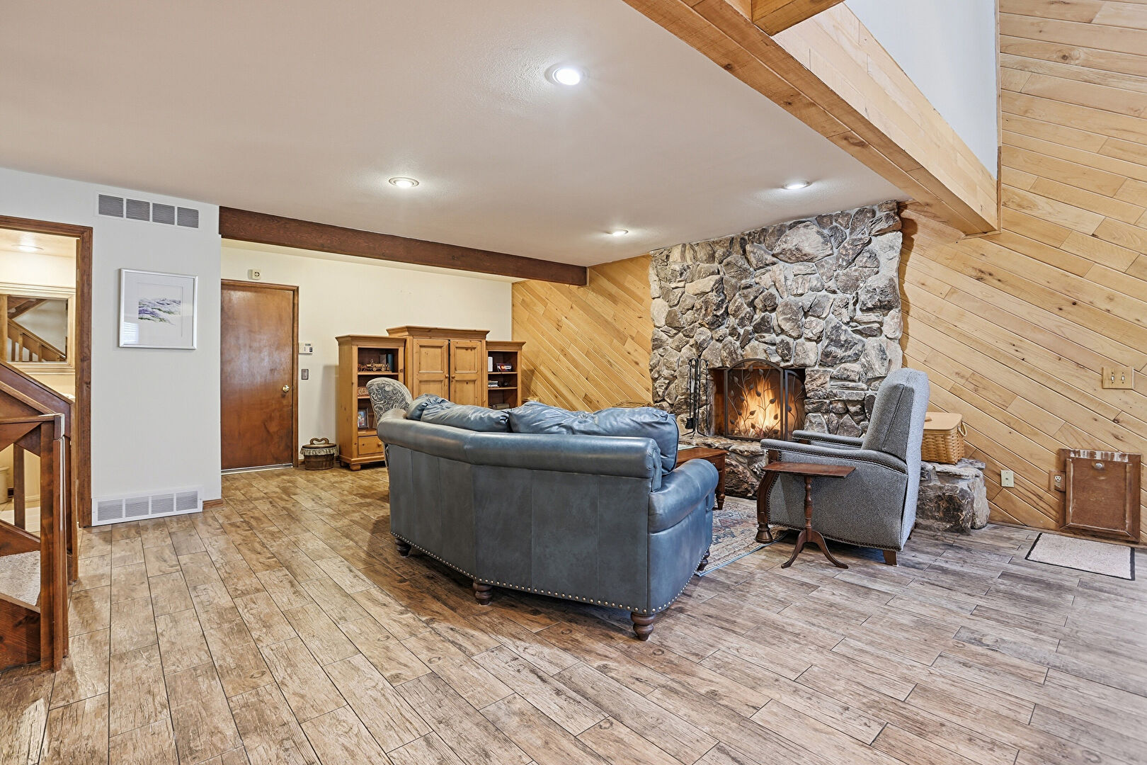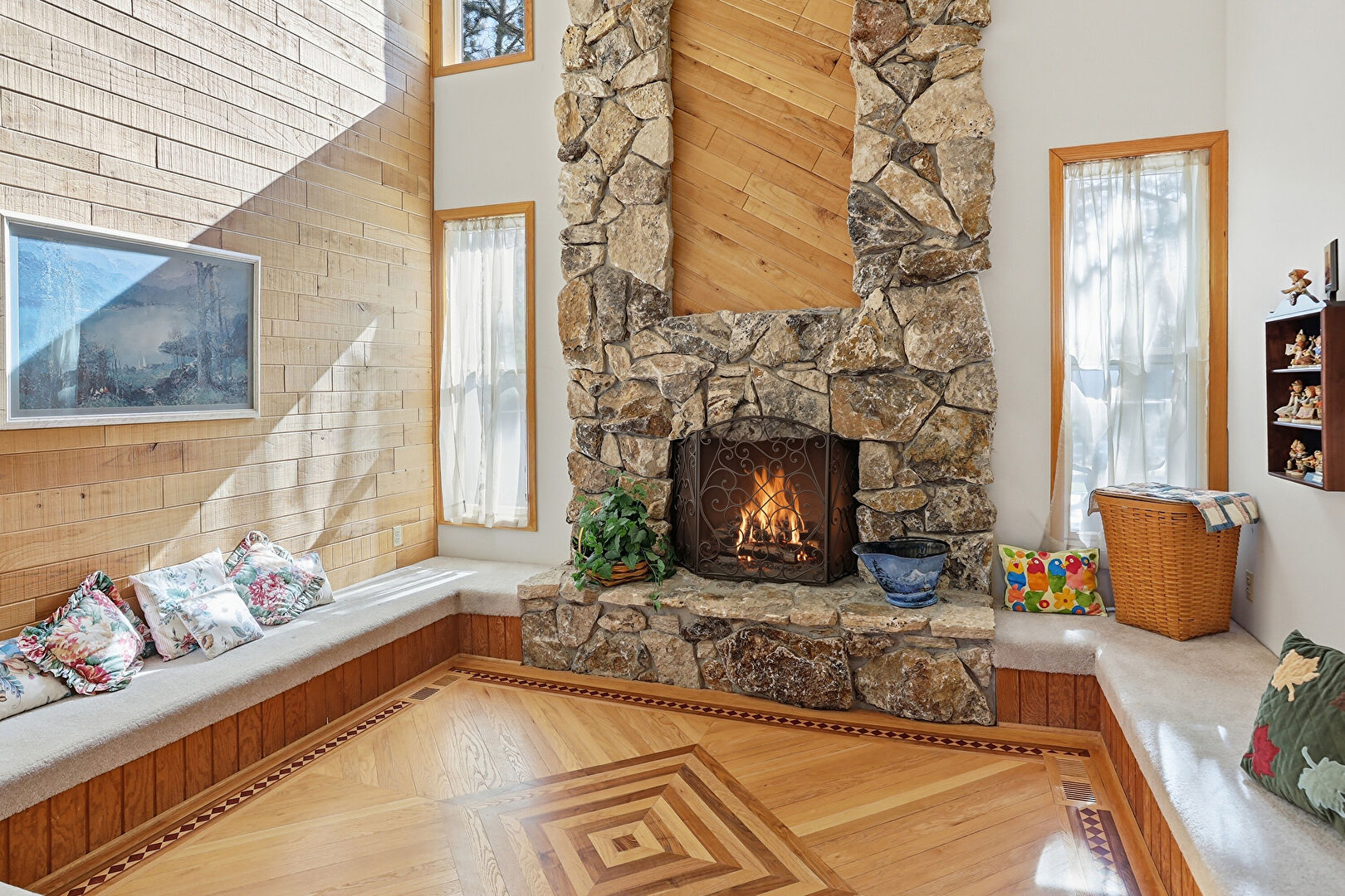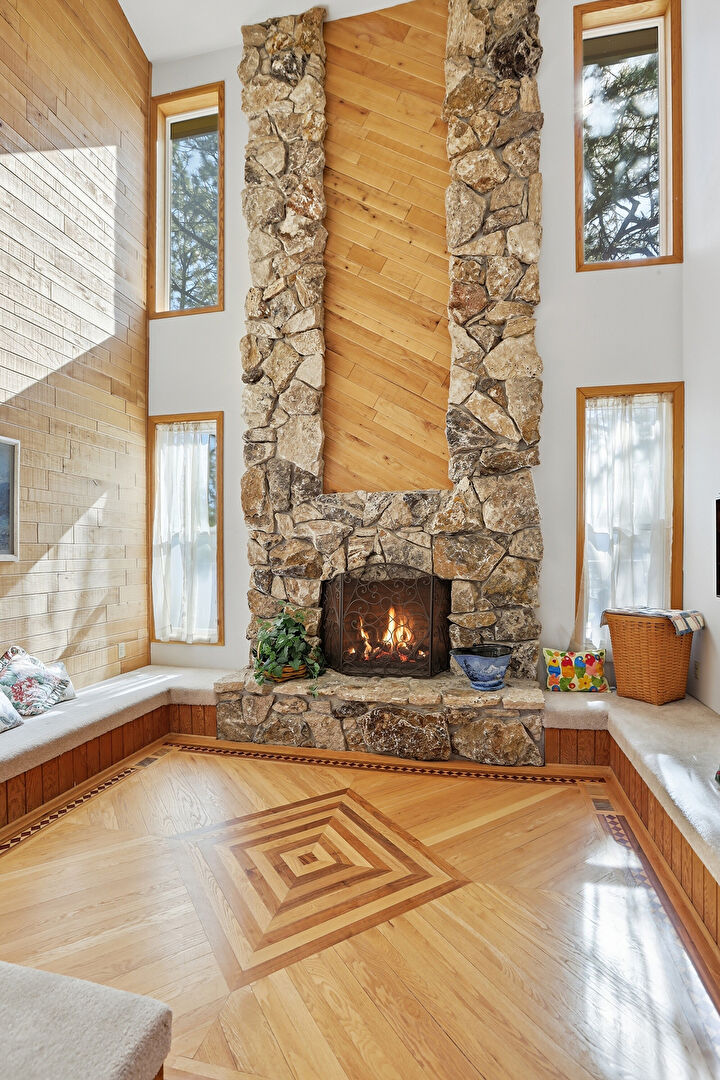 Baseboards Wall, Beamed Ceiling, Carpet, Drywall, Fireplace, High Ceiling, Natural Light, Notable Chandelier, Stone Wall, Vent, Wood Finish Floor, Wood Wall, Carpet, Fireplace, Natural Light, Vent