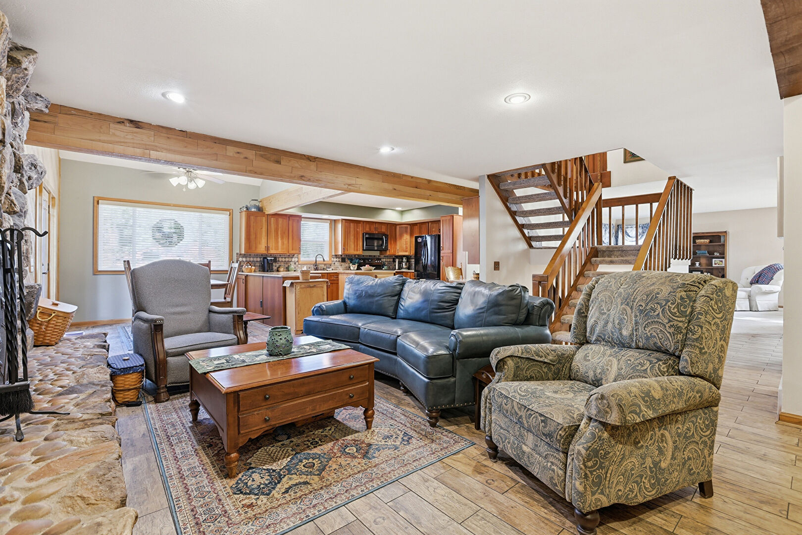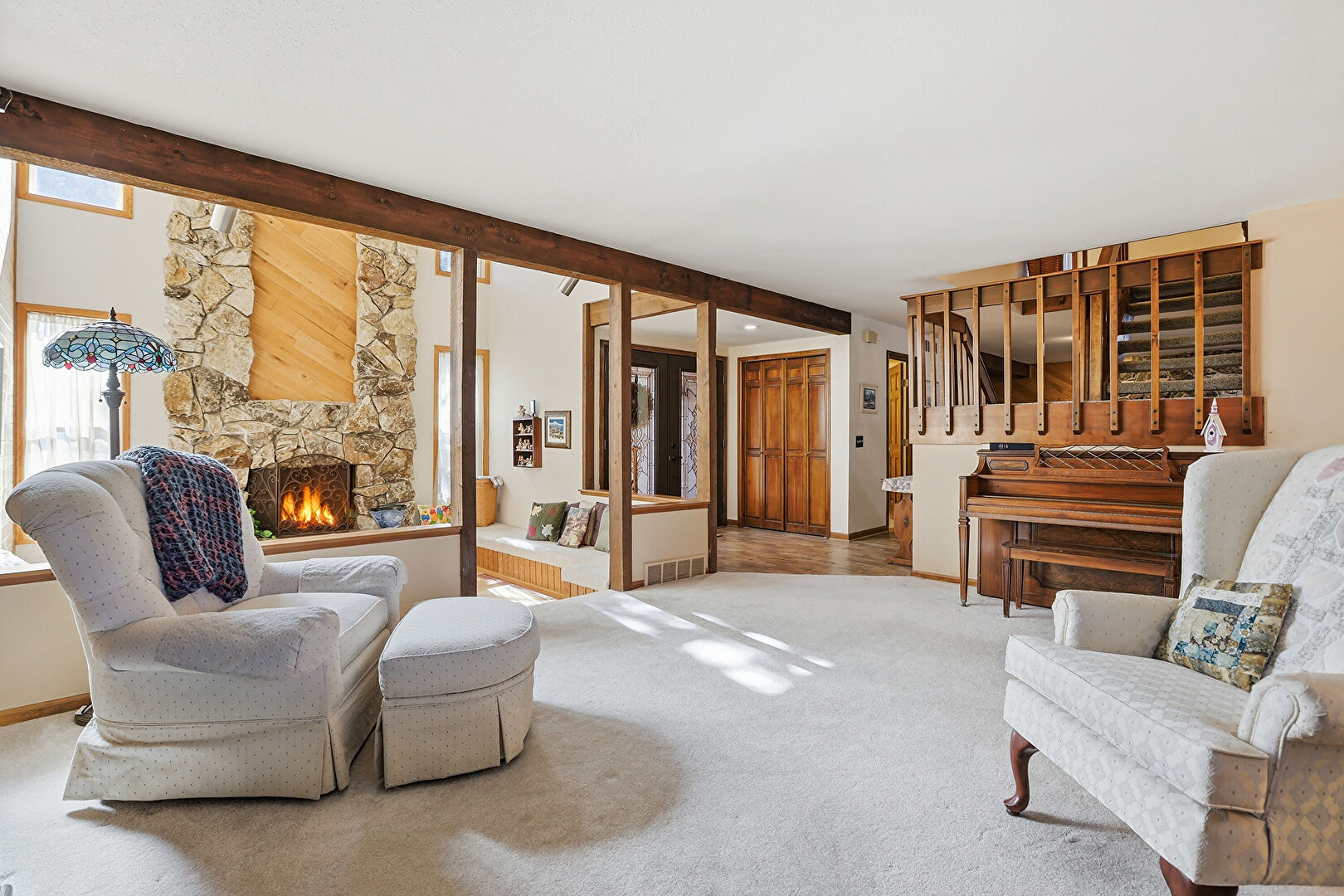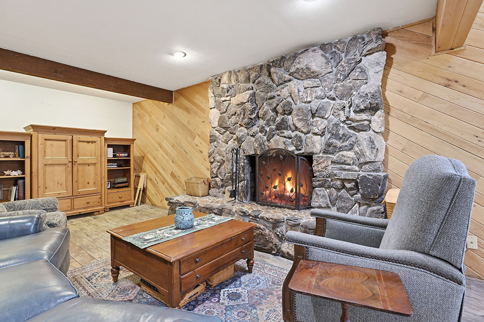 Baseboards Wall, Beamed Ceiling, Carpet, Drywall, Fireplace, High Ceiling, Natural Light, Notable Chandelier, Stone Wall, Vent, Wood Finish Floor, Wood Wall, Carpet, Fireplace, Natural Light, Vent